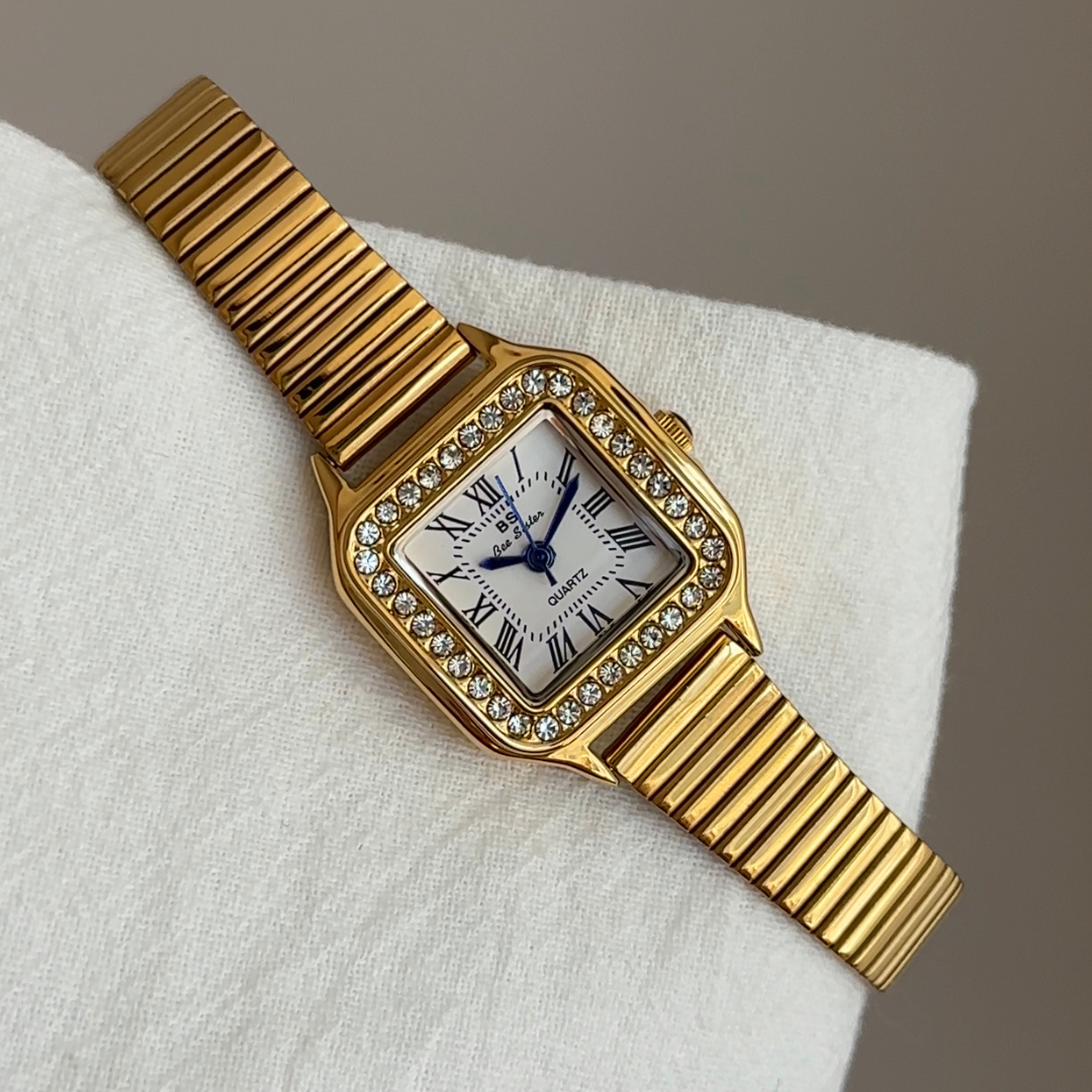 Delicate yet striking, this elegant women’s quartz watch features a white square dial framed with diamond accents and a gold stainless steel bamboo-style bracelet. The refined design blends classic elegance with modern chic, making it a perfect accessory for both formal and everyday wear.