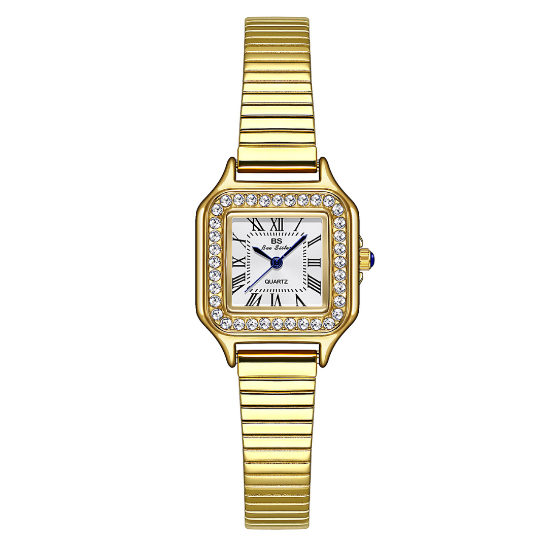 Elegant Women’s Quartz Watch – Gold Stainless Steel Bamboo Bracelet with Diamond-Accented White Square Dial