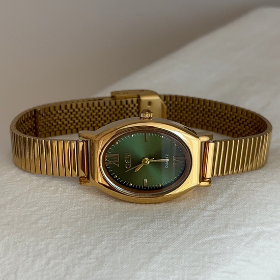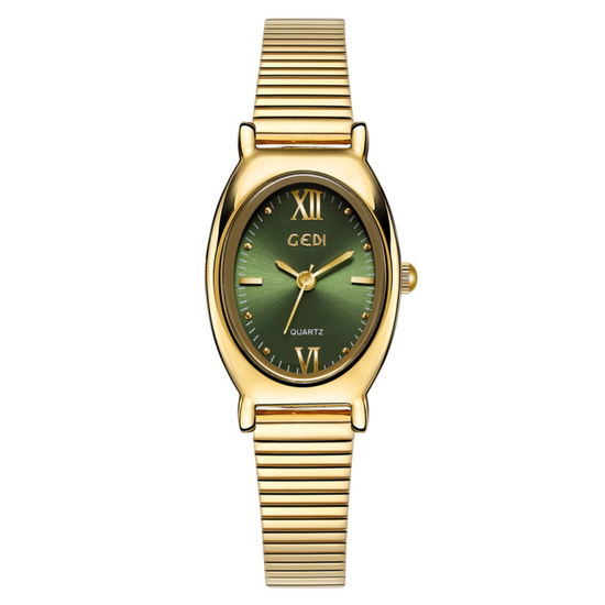 Unique Women’s Quartz Watch – Green Oval Dial with Gold Stainless Steel Band, Waterproof Elegant Design