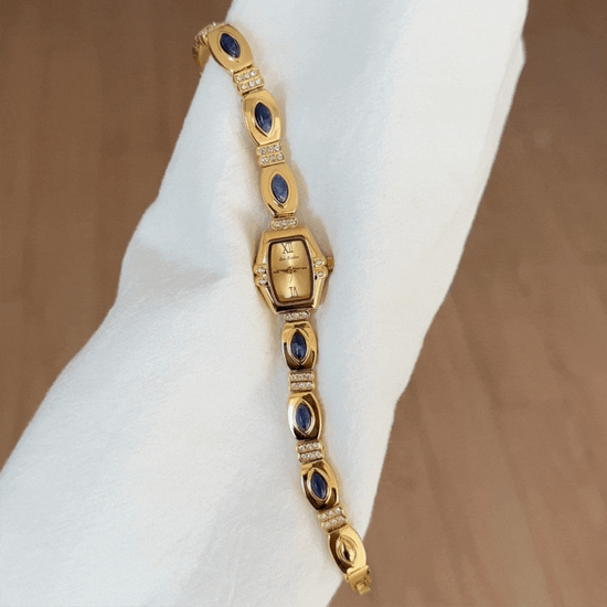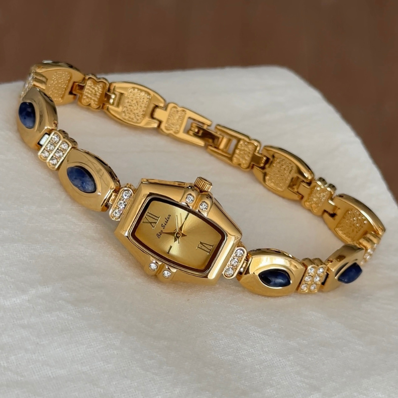 Elegant Vintage Watch with Gold Dial, Blue Gemstone Accents & Alloy Bracelet, Quartz Movement