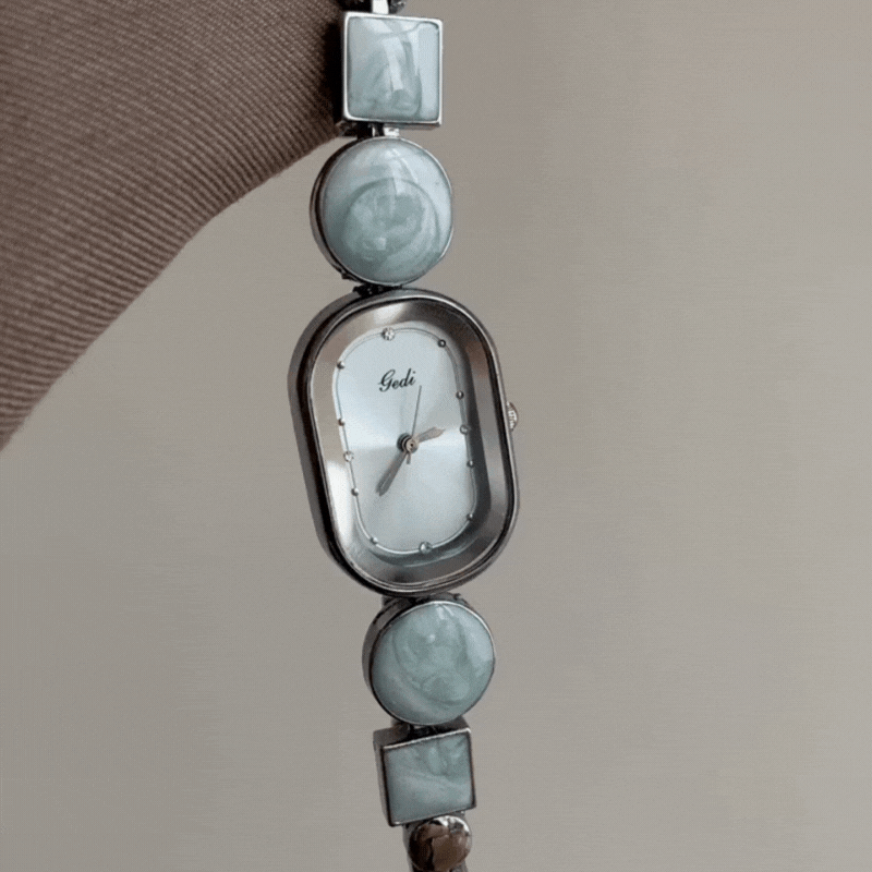Dette quartz-ur til kvinder har en poleret oval sølvfarvet urskive, parret med et særpræg geometrisk armbånd der udvisker grænsen mellem smykker og ur. Rent, men iøjnefaldende, er det et moderne tilbehør designet til dem, der værdsætter form, proportioner og stille sofistikering.