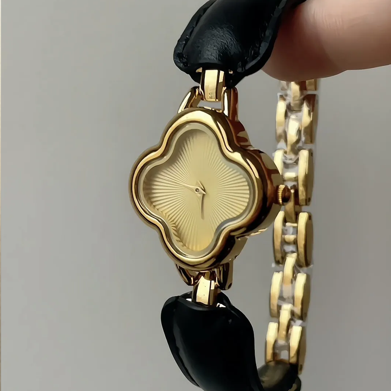 Introduktion af Golden Clover Charm-uret, en fantastisk blanding af elegance og charme. Med en sofistikeret sort og guld læderrem, prydet med et firkløvermotiv, udstråler dette ur tidløs skønhed. Den minimalistiske urskive forstærker den luksuriøse følelse, mens det præcise kvartsurværk sikrer pålidelighed. Perfekt til at tilføje et strejf af ynde til både hverdagsbrug og særlige lejligheder, er dette ur det ultimative tilbehør til den moderne kvinde.