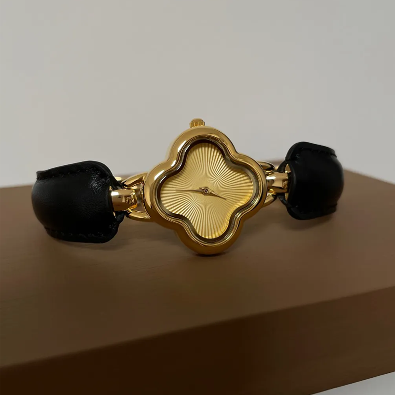 Golden Clover Charm Timepiece: Black & Gold Leather Quartz Watch
