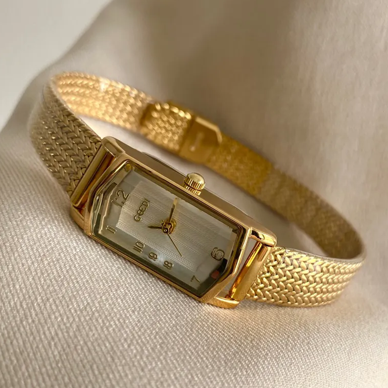 Introduktion af Golden Sheaf Petite, et delikat og stilfuldt ur med en fint udformet hvedemønstret guldrem og en ren hvid urskive. Dette elegante ur er designet til at komplementere både afslappet og formelt tøj og tilføjer et strejf af sofistikering til dit look.