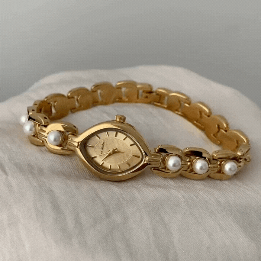 Dette udsøgte kvartsur blander Vintage charme med moderne elegance, med en marquiseformet guld urskive og en guldkædearmbånd prydet med fine perlerMed præcist kvartsurværk og et sofistikeret design, er det det perfekte statement-tilbehør til dem, der værdsætter klassisk skønhed med et strejf af unikhed.