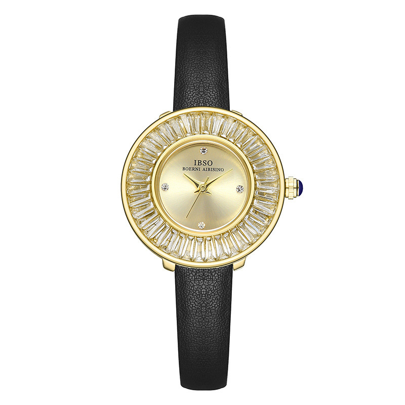 This elegant quartz watch for women combines classic charm with modern sophistication. Designed with a slim black genuine leather strap, a gold-tone round case, and a large crystal-accented dial, it makes a bold yet refined statement.