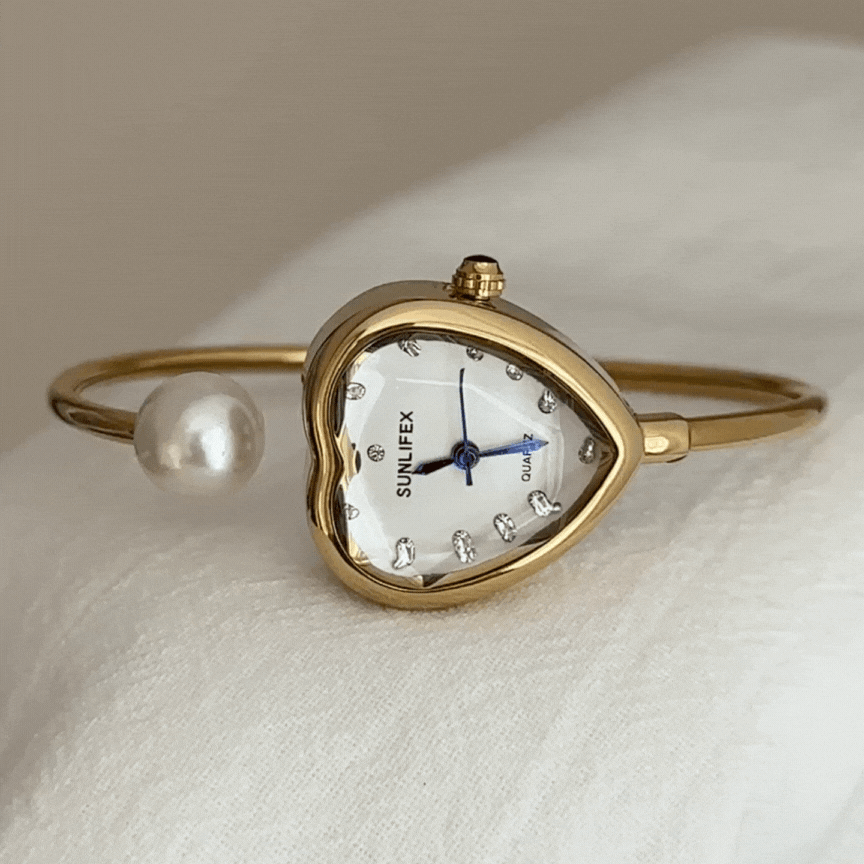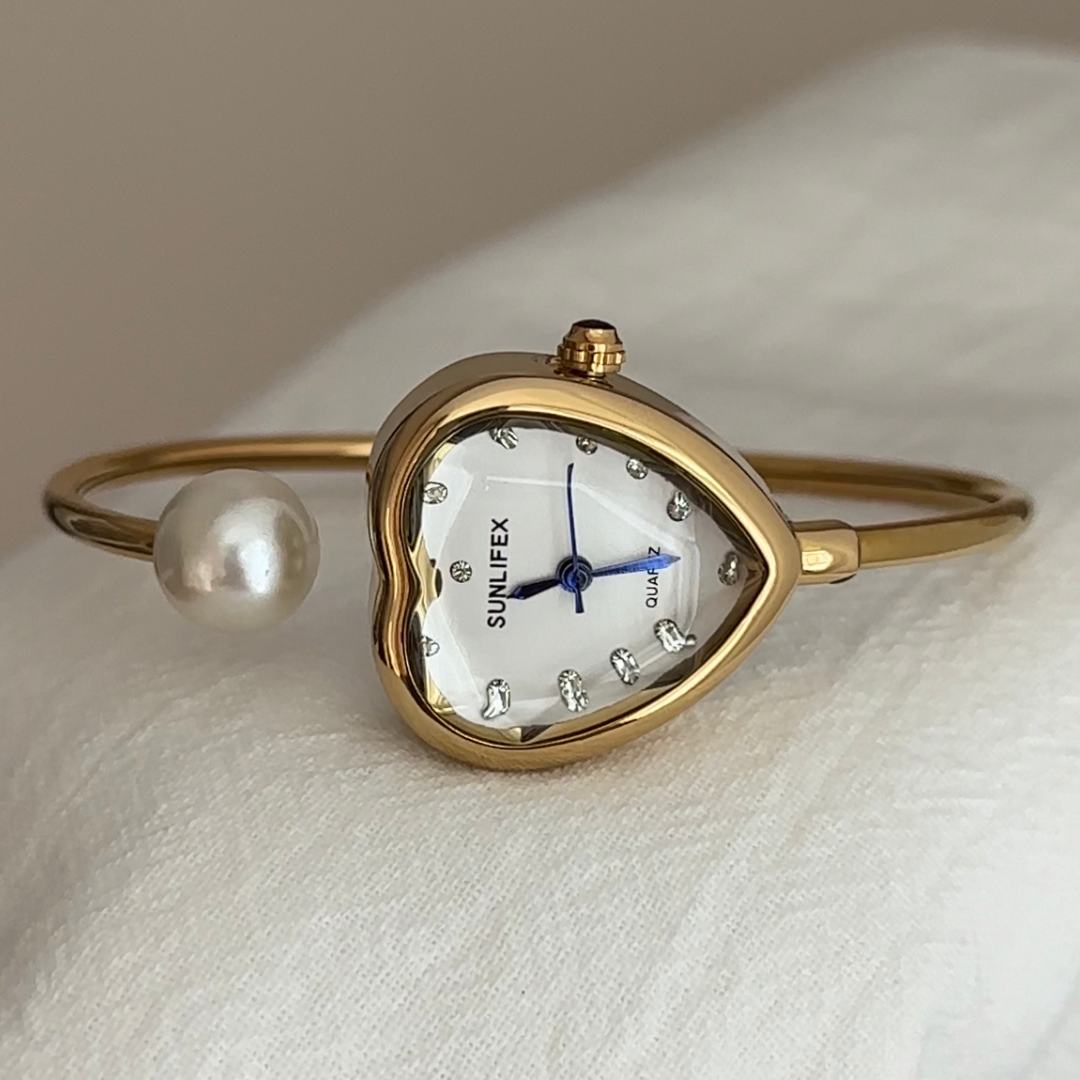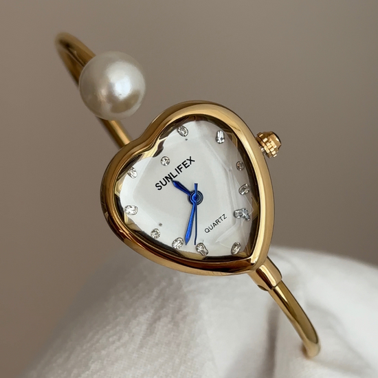 Romantic and refined, this elegant women’s quartz watch blends the artistry of jewelry with the precision of timekeeping. The gold bangle bracelet is delicately embedded with pearls, while the heart-shaped white dial adds a touch of feminine charm and sophistication.