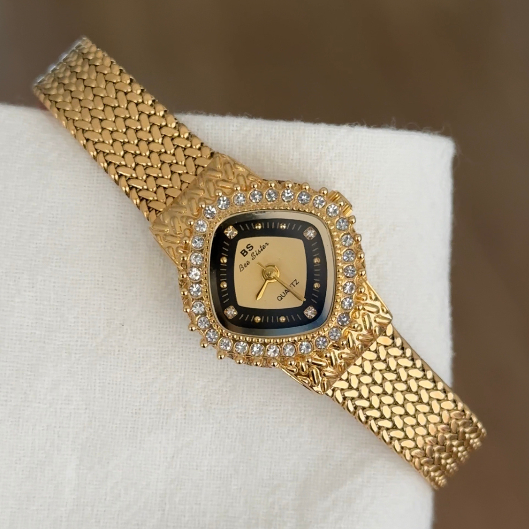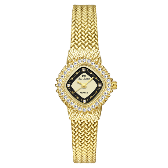 The Golden Sheaf Quartz Watch radiates elegance and confidence with every detail. Featuring a luxurious gold wheat-link bracelet, a diamond-shaped case adorned with shimmering crystals, and a sophisticated black-edged gold dial, this timepiece feels like fine jewelry on the wrist. Designed for women who appreciate vintage-inspired glamour and modern refinement, it adds instant polish to any outfit.