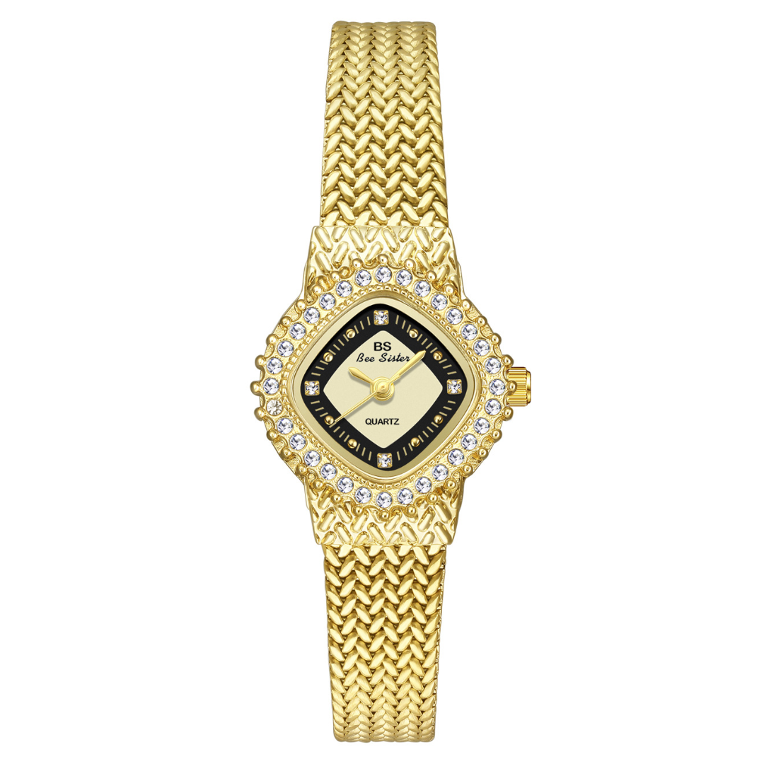 Golden Sheaf – Women’s Quartz Watch with Diamond-Shaped Crystal Case, Black-Edged Gold Dial, and Wheat-Link Bracelet