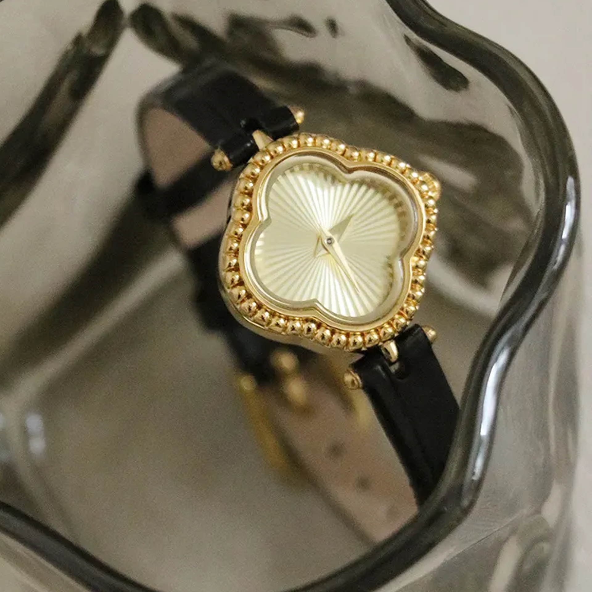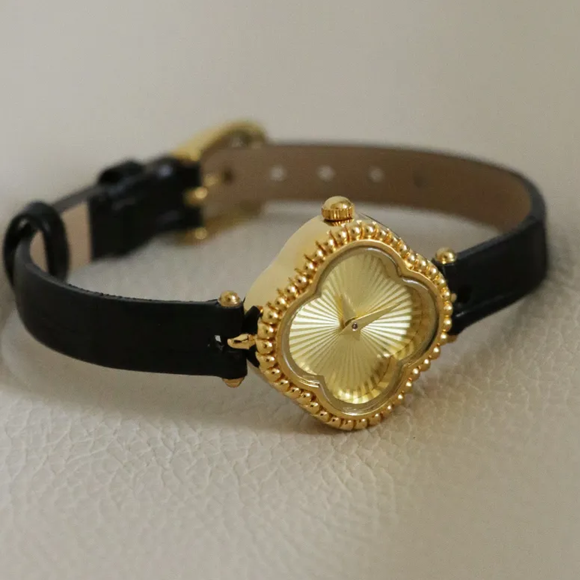 Lucky Clover Gold Dial Black Leather Women's Quartz Watch