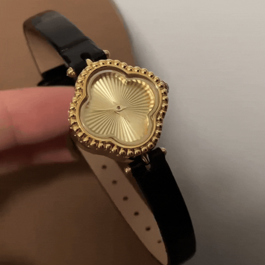 Celebrate timeless elegance and fortune with this Black Leather Strap Gold-Tone Case Clover Design Women's Quartz Watch. Crafted for sophistication, this watch features a luxurious gold-tone case and a bold gold dial adorned with a delicate four-leaf clover motif, symbolizing luck and positivity. Paired with a sleek black leather strap, it effortlessly balances classic charm and modern style. Powered by precise quartz movement, this watch ensures reliable accuracy while serving as a meaningful accessory for everyday wear or special occasions.