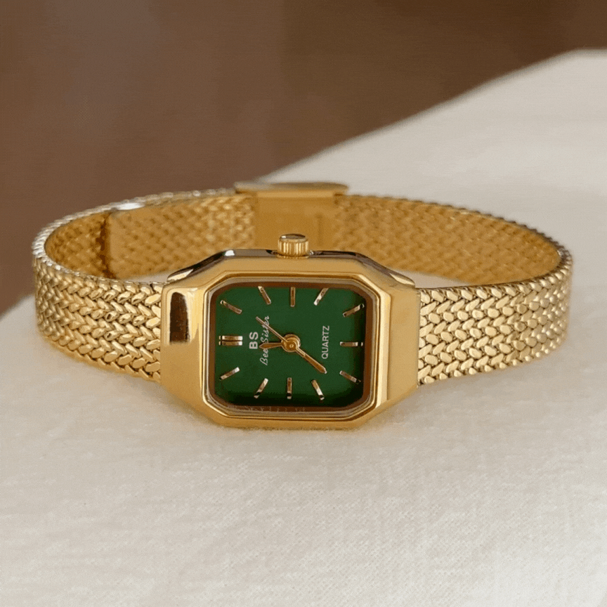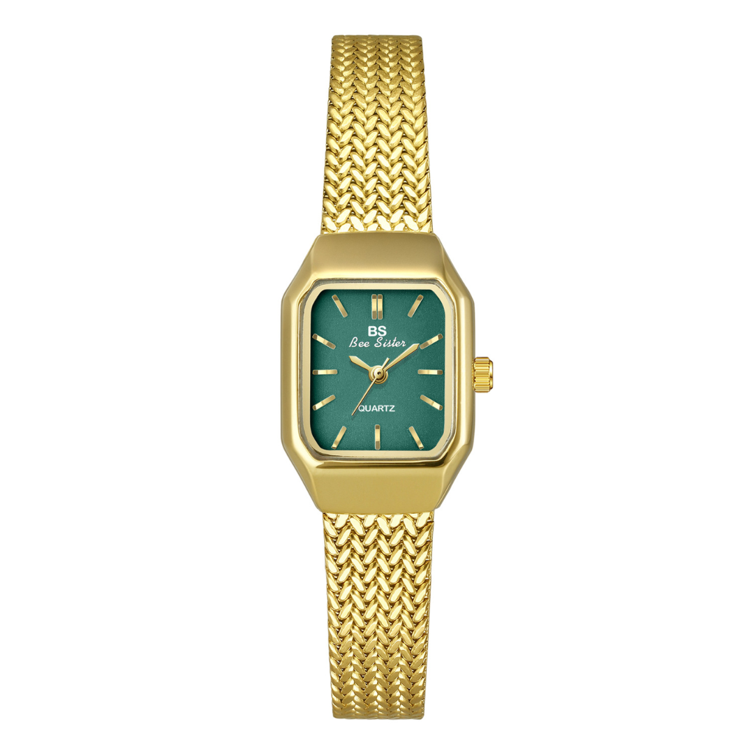 Minimalist Elegant Women’s Quartz Watch – Gold Wheat Chain Strap, Green Square Dial