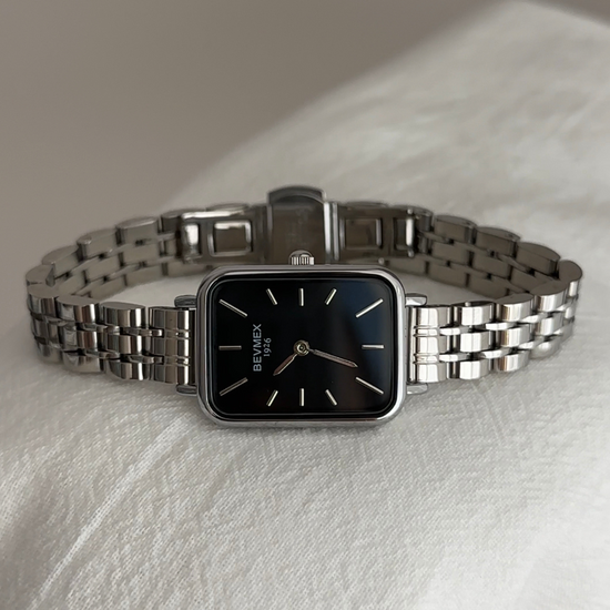 Embrace sleek modern style with this minimalist women’s quartz watch, featuring a black rectangular dial paired with a polished silver stainless steel strap. Its clean lines and understated design make it a versatile accessory for everyday wear and professional settings.