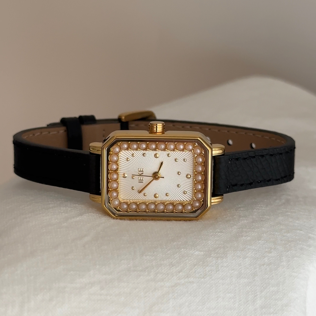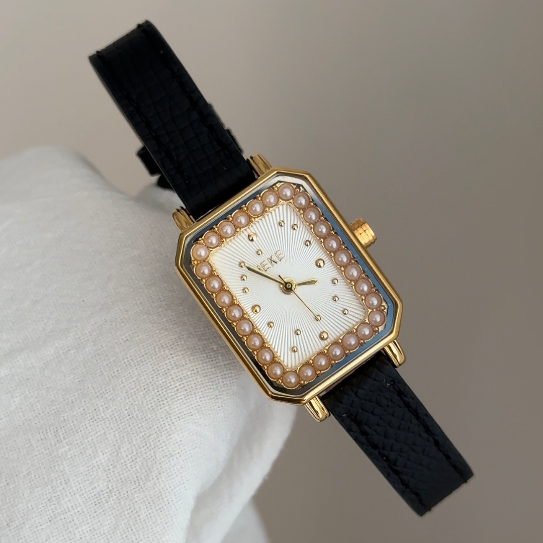 The Noir Elegance Quartz Watch is a statement of refined sophistication. Featuring a slim black genuine leather strap, a polished gold rectangular case, and a luminous pearl-accented crystal bezel, this timepiece captures the balance between timeless grace and modern glamour. Perfect for women who appreciate subtle luxury, it transitions effortlessly from daytime chic to evening elegance.