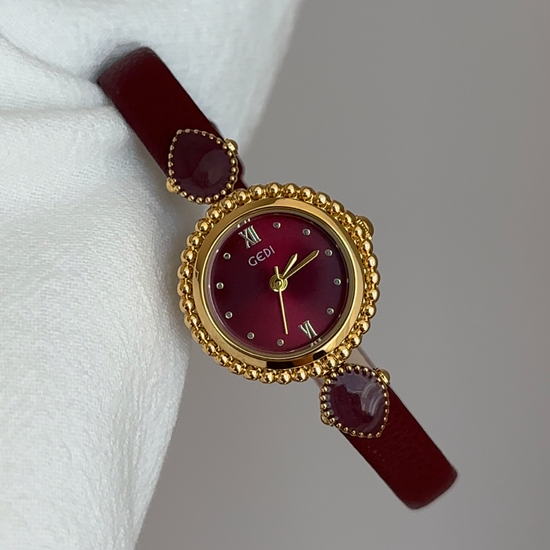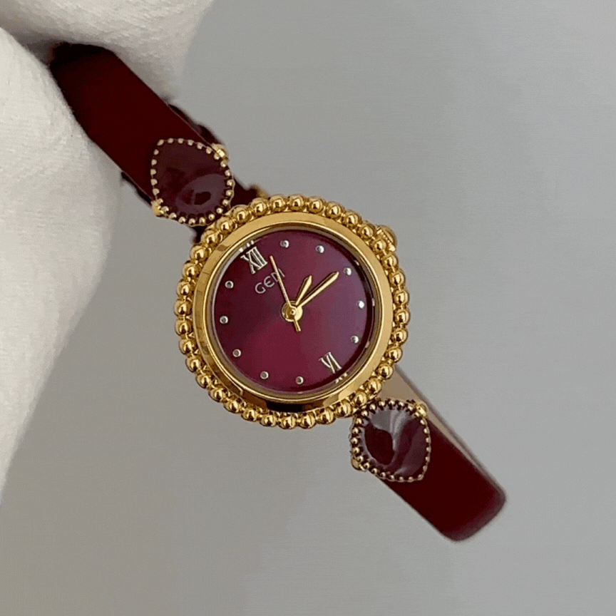 Red Women’s Watch – Vintage Round Dial Quartz Watch with Gold Case & Leather Strap | Amour