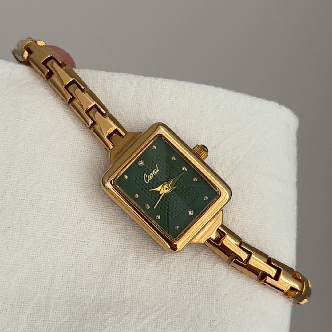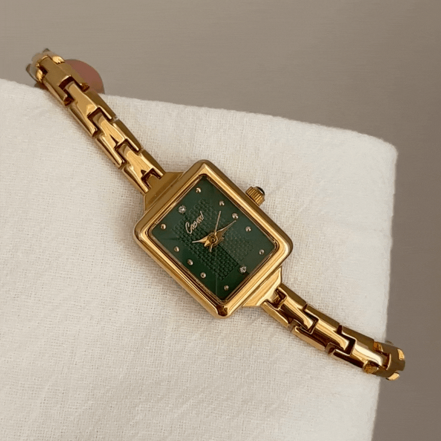 Delicate yet striking, this vintage-inspired women’s quartz watch features a small green rectangular dial set in a radiant gold-tone bracelet design. Its compact size and retro charm make it the perfect accessory for women who love understated elegance with a touch of uniqueness.