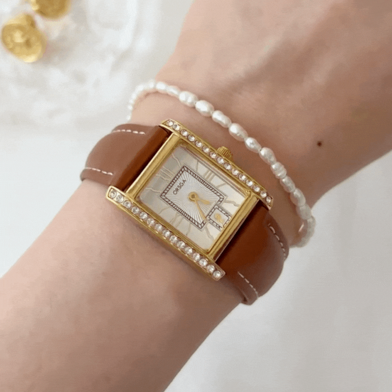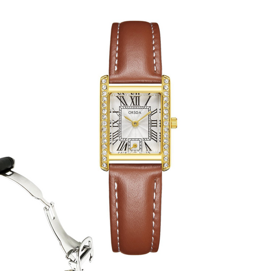 Laurel is an homage to vintage refinement, featuring a women’s leather watch with a rich brown strap, rectangular gold case delicately studded with crystals, and elegant Roman numeral markers on a clean white dial.