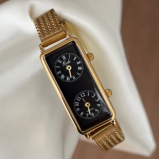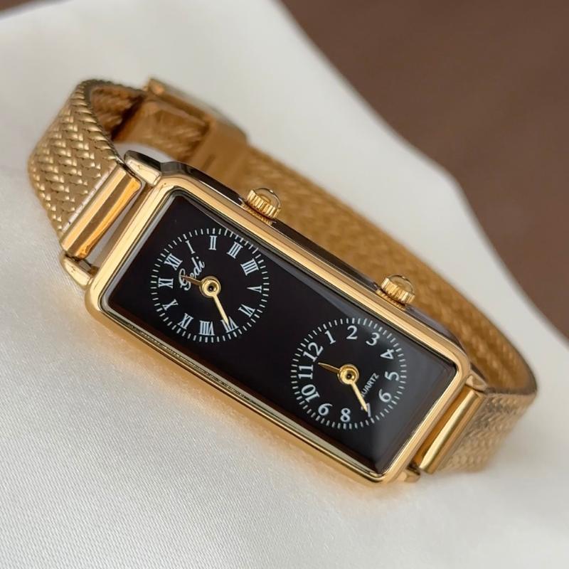 This exquisite dual time watch combines vintage elegance with modern functionality. The sophisticated black dial features dual time zone displays, making it perfect for frequent travelers and global business professionals. Encased in a polished gold rectangular frame, the timepiece is complemented by a uniquely designed wheat-pattern bracelet that adds a touch of classic sophistication. Powered by reliable Japanese quartz movement, this watch ensures accurate timekeeping while maintaining its elegant appearance.
