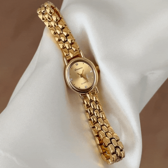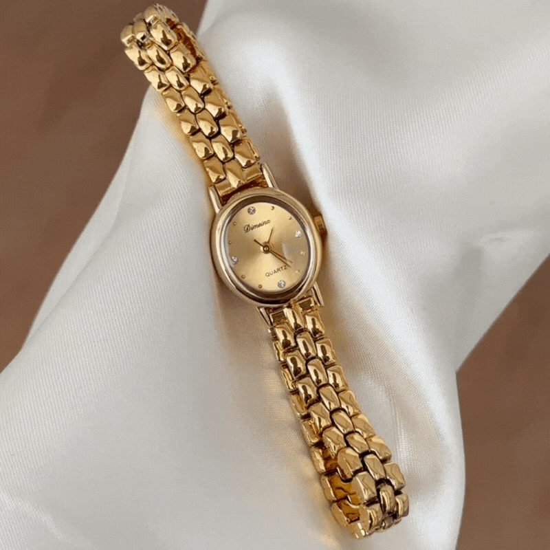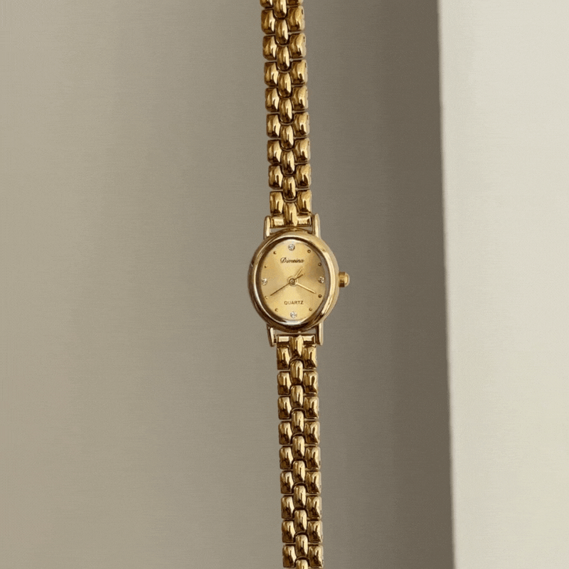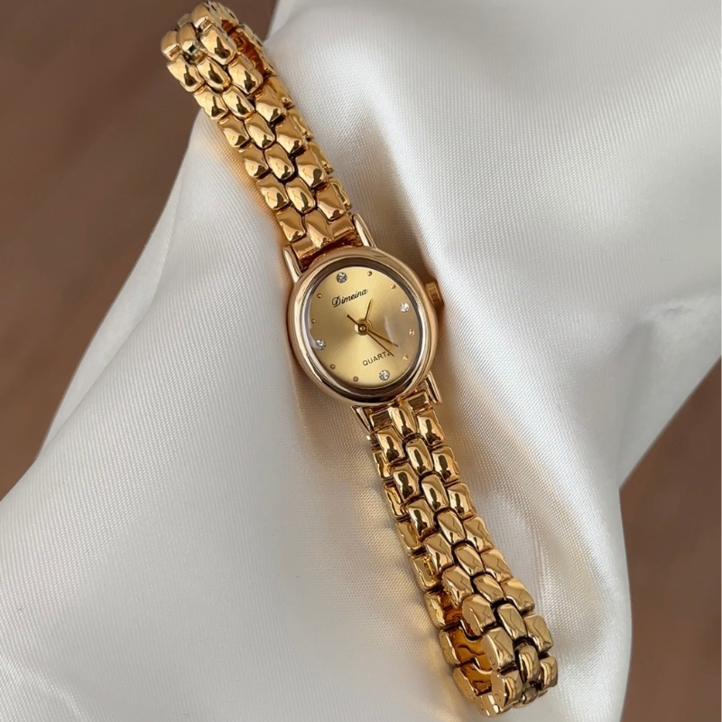 Radiating timeless sophistication, this watch presents a gold oval dial harmoniously paired with matching bezel and alloy bracelet, engineered for enduring comfort and durability.