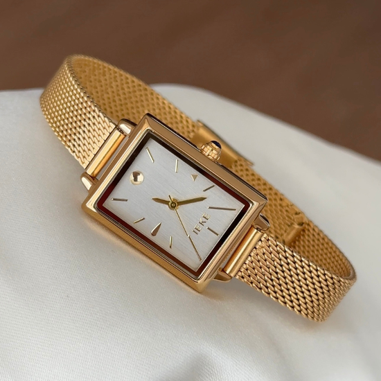 This sophisticated timepiece combines refined intellect with timeless elegance through its crisp white rectangular dial set in a polished gold bezel. The gold-tone alloy bracelet features an artistic wheat-stem motif, symbolizing wisdom and prosperity.