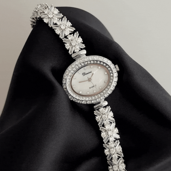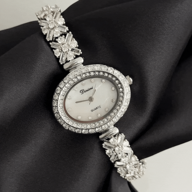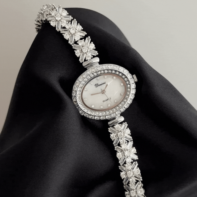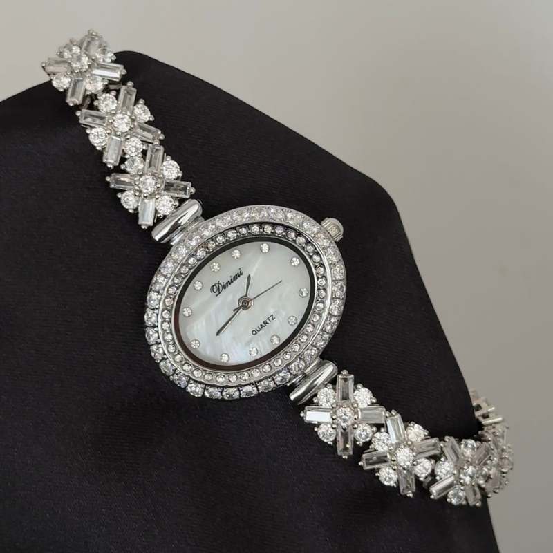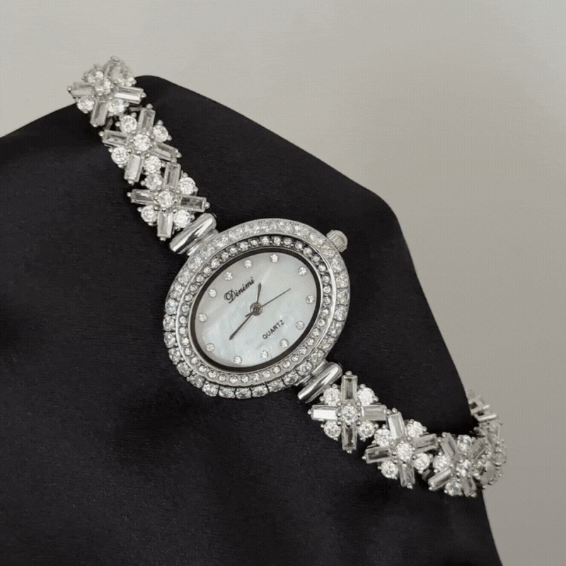 Reflecting a luminous modern elegance, this watch seamlessly merges refined style with subtle brilliance. It features a soft white oval pearlescent dial framed by a silver crystal-set bezel and a matching bracelet embedded with cubic zirconia. Reliable quartz movement ensures precise timekeeping, while slender silver hands offer clear readability. The adjustable, scratch- and water-resistant bracelet provides secure comfort for daily wear. Transitioning effortlessly from day to evening, it serves as both a functional timepiece and a polished accessory—ideal as a gift or personal indulgence that embodies graceful contemporary sophistication.