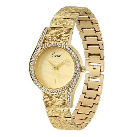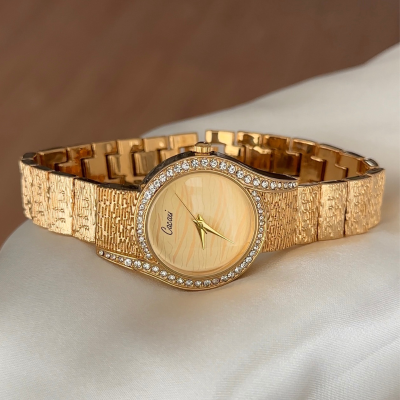 Indulge in luxurious elegance with our Round Gold Dial Watch, a stunning timepiece that combines sophisticated design with brilliant craftsmanship. This exquisite watch features a radiant gold dial surrounded by a bezel meticulously set with sparkling crystals, creating a captivating play of light with every movement. The matching gold-tone alloy bracelet completes this glamorous look, offering both durability and timeless beauty.