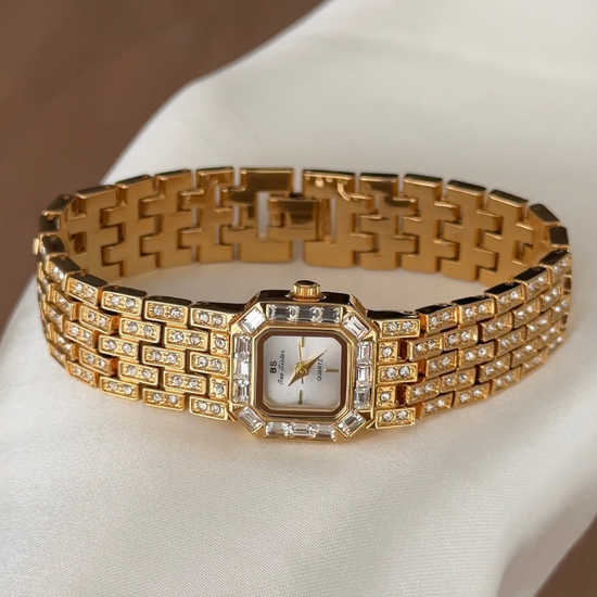 Elegant and luxurious, this quartz watch features a stunning white rectangular dial, exuding modern sophistication. The exquisite gold-toned bezel and matching alloy bracelet are beautifully adorned with sparkling diamond accents, adding a touch of glamour to any outfit.