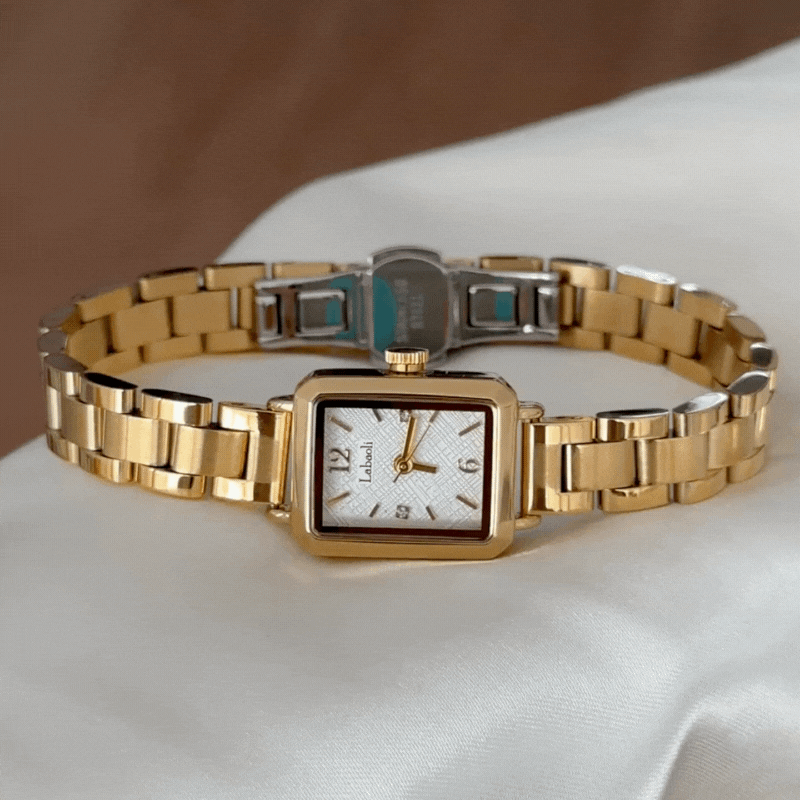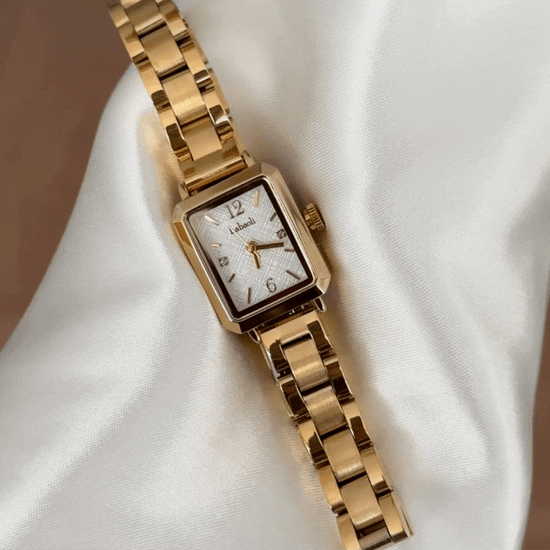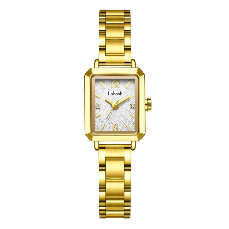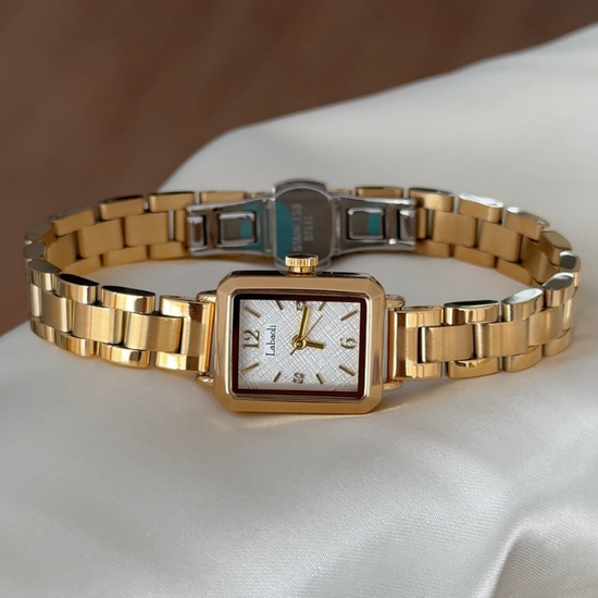 Uncover lasting refinement through our rectangular white dial creation. A spotless white dial is artistically enclosed by a streamlined gold case, flowing naturally into a corresponding alloy band. The exquisite interplay between glowing white and brilliant gold results in an exceptionally versatile companion that projects understated grace, perfectly adapted for workplace requirements and special moments alike.