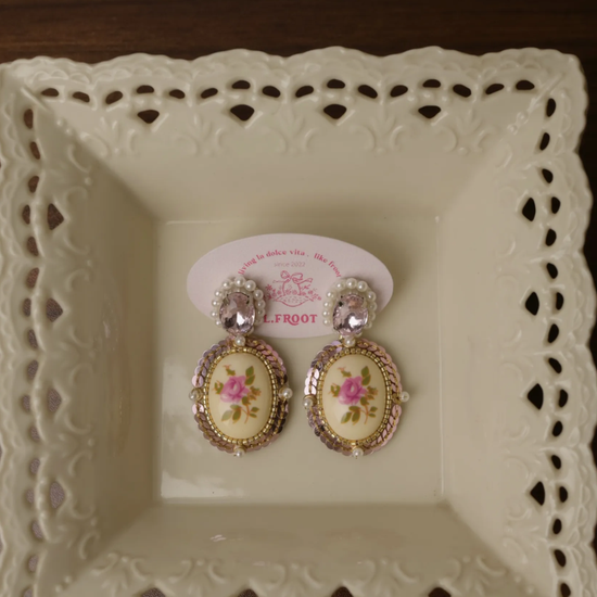Each earring is hand-embroidered with fine beads and floral details, creating a textured, luxurious look that feels both delicate and distinctive. The vintage-inspired color palette and intricate craftsmanship make it a standout accessory for those who love light luxury and small-batch design.