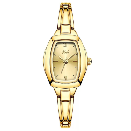 Elegant for daily wear, this sophisticated timepiece features a gold tonneau-shaped dial with matching bezel and alloy bracelet for a seamless luxurious look. Precision-engineered with a secure clasp and reliable quartz movement, it ensures accurate timekeeping and lasting comfort.
