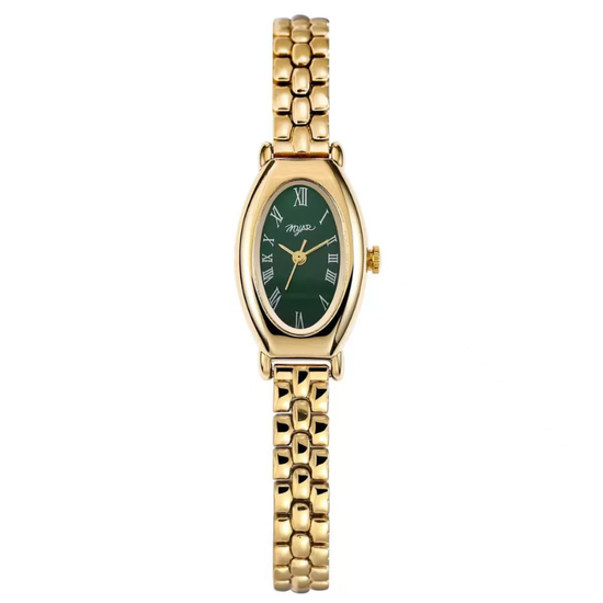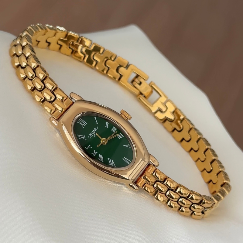 Embrace sophisticated style with our exquisite gold-tone quartz watch, featuring a stunning emerald green oval dial elegantly framed by a matching gold bezel. This distinctive timepiece artfully blends vintage inspiration with contemporary elegance, creating a captivating accessory for the modern woman with refined taste.