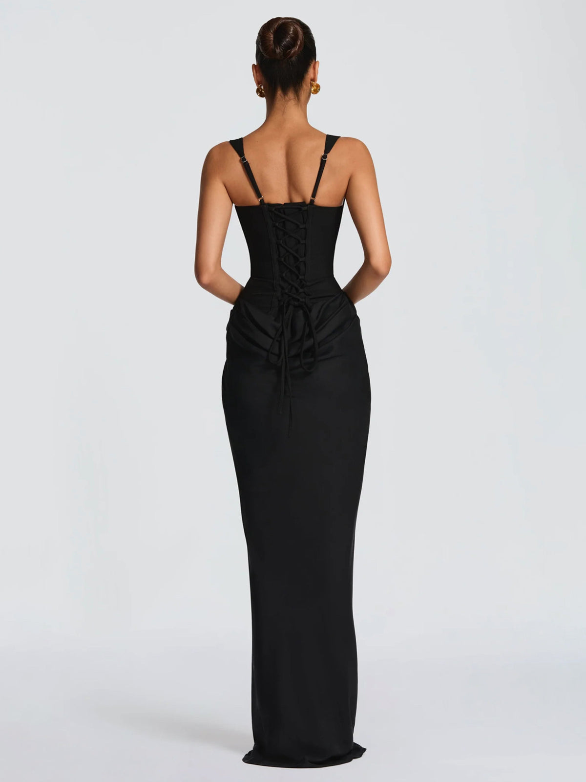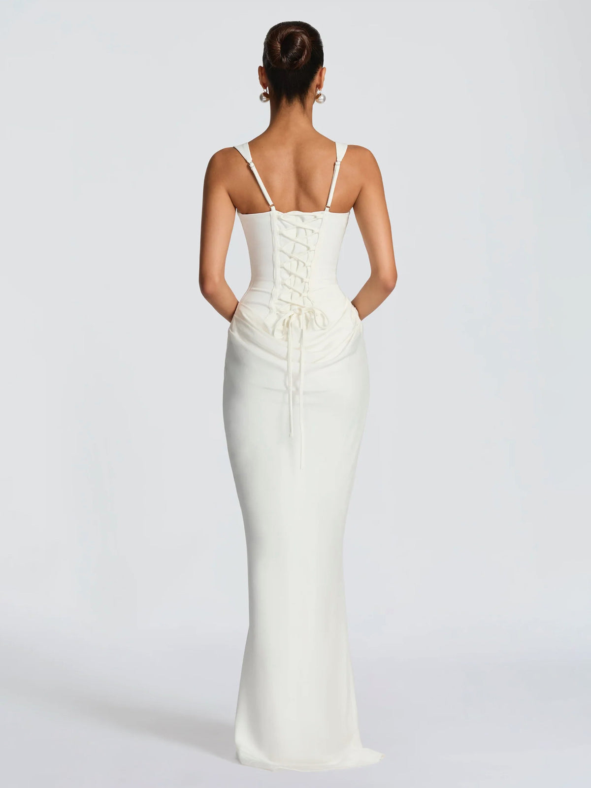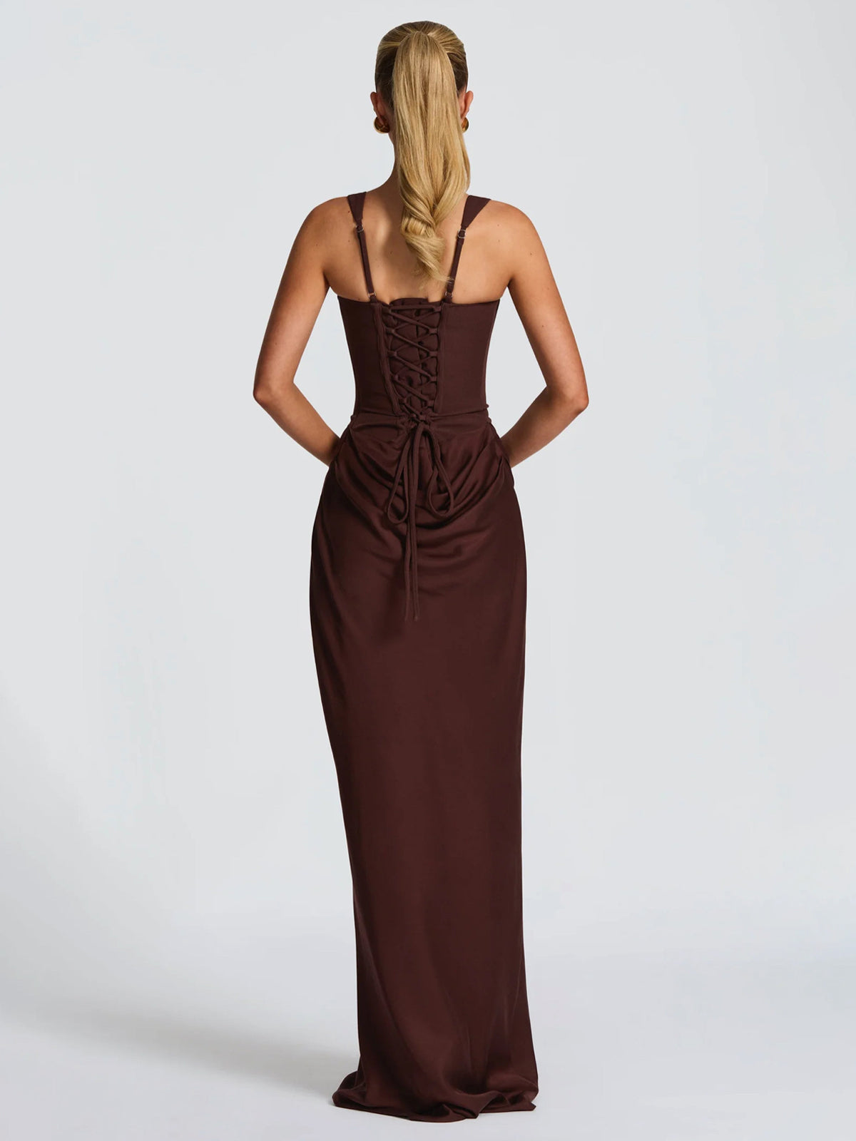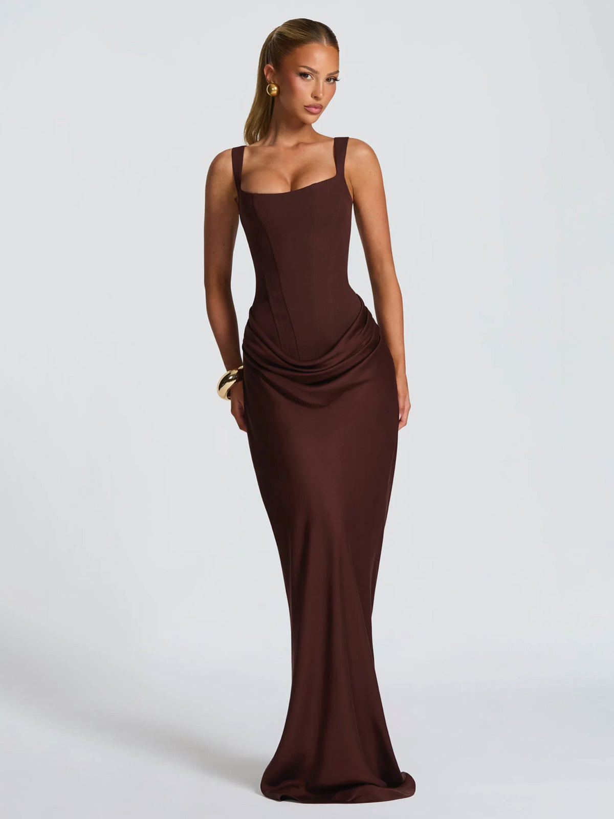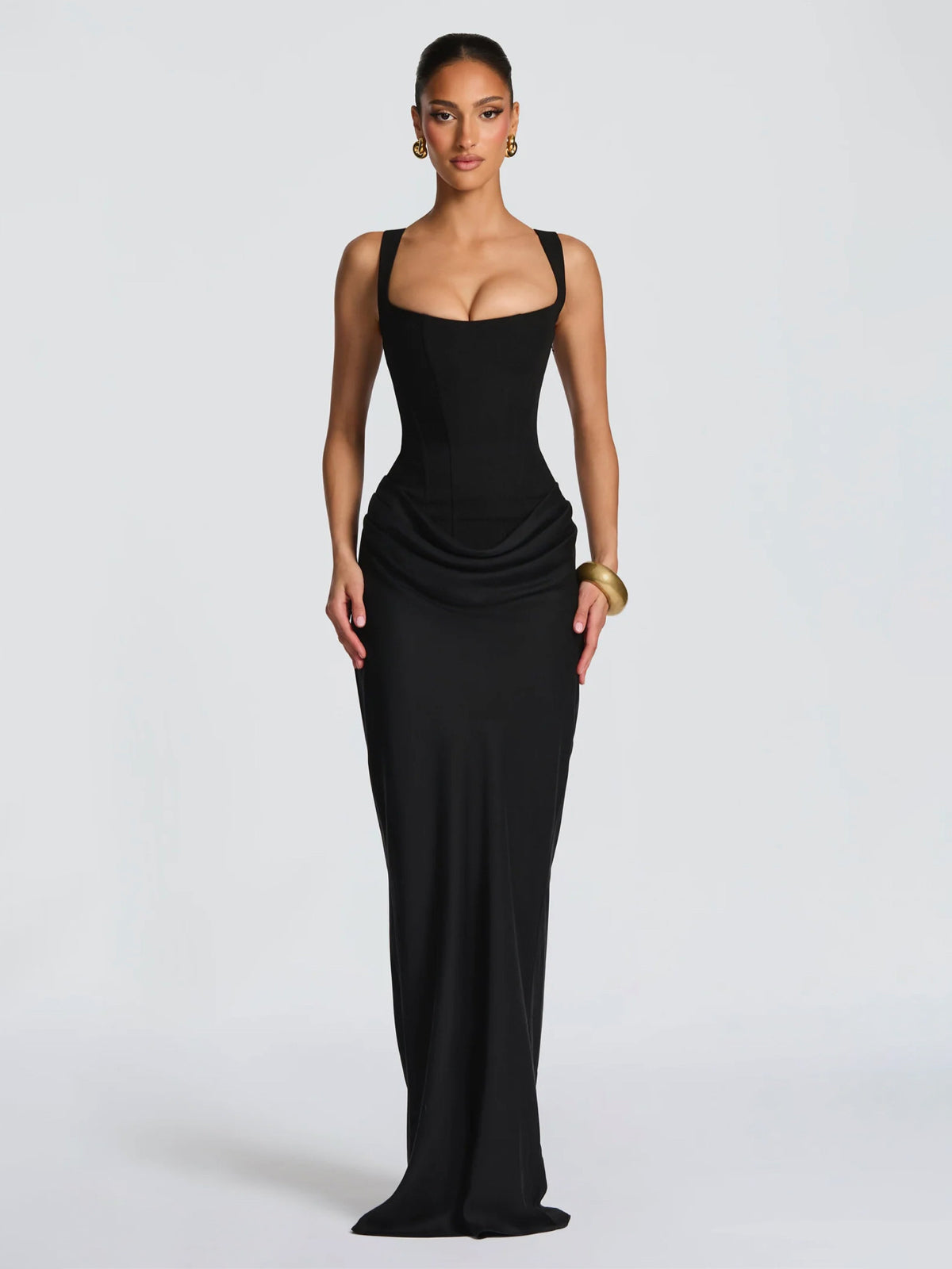 Structured Corset Bodice Lace-Up Back Draped Maxi Dress