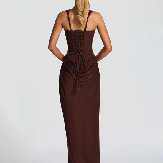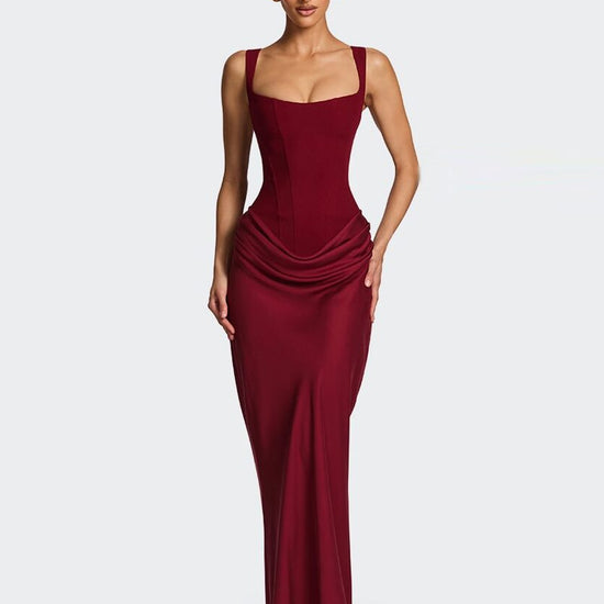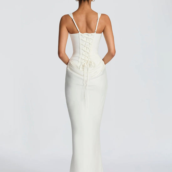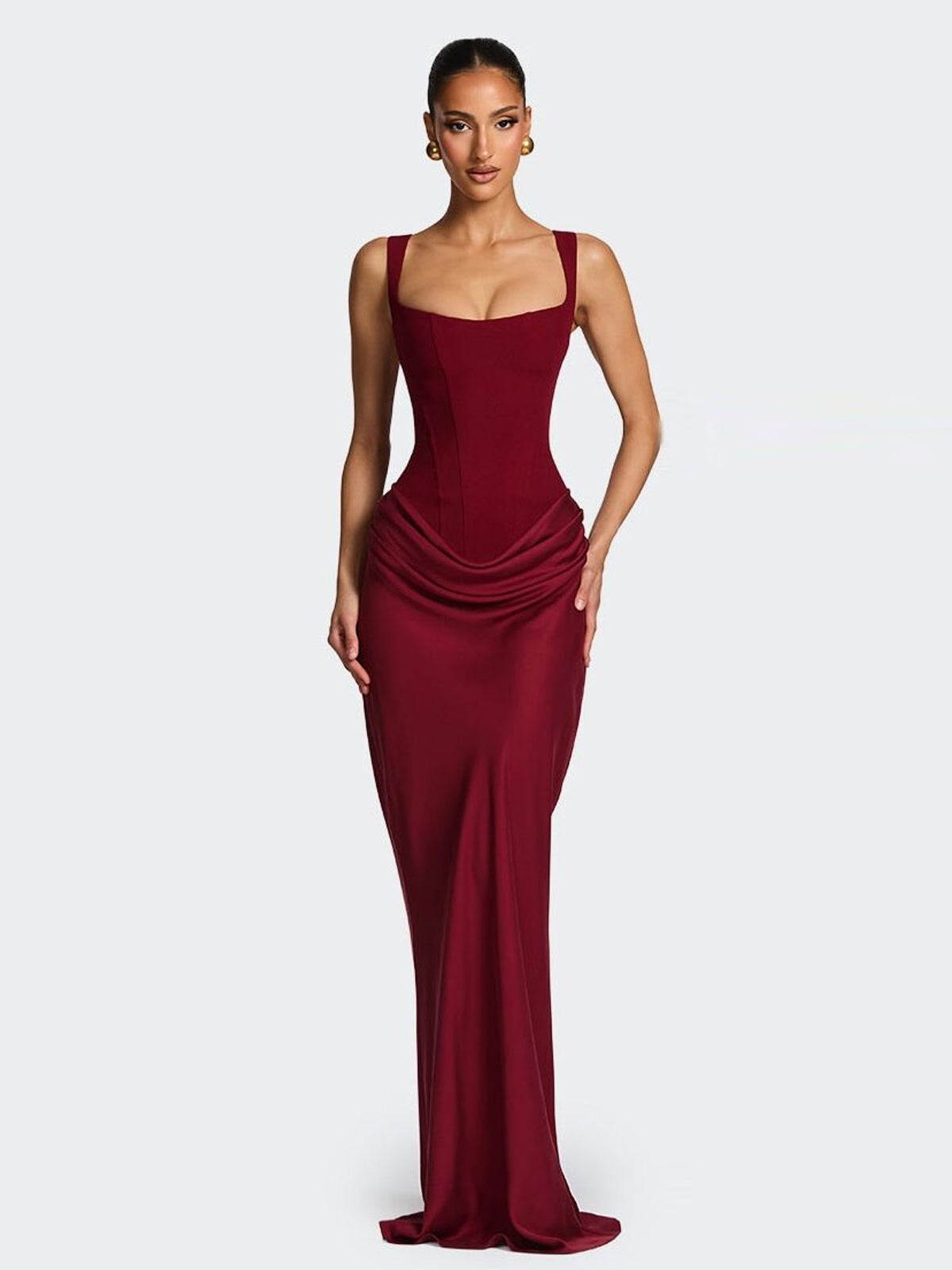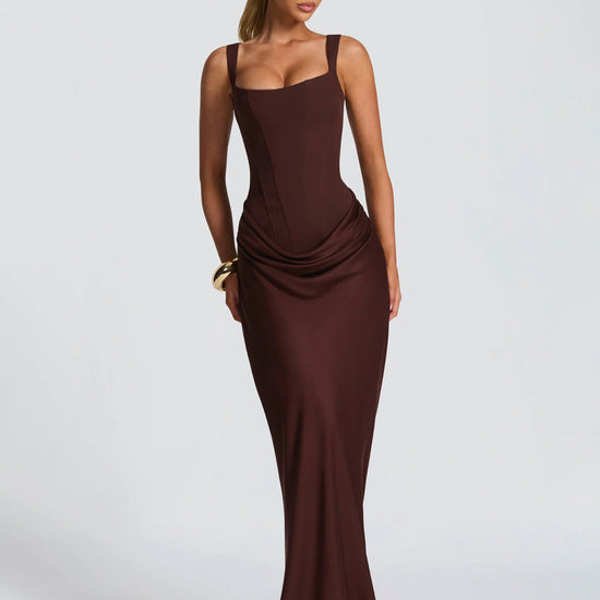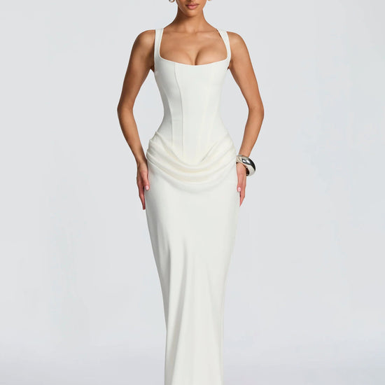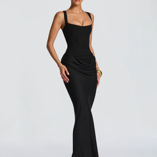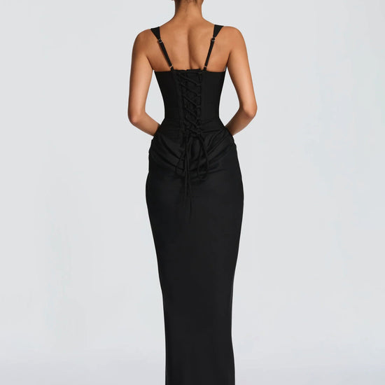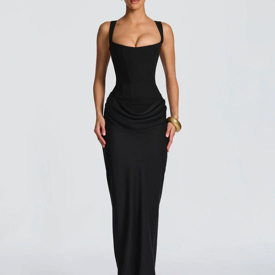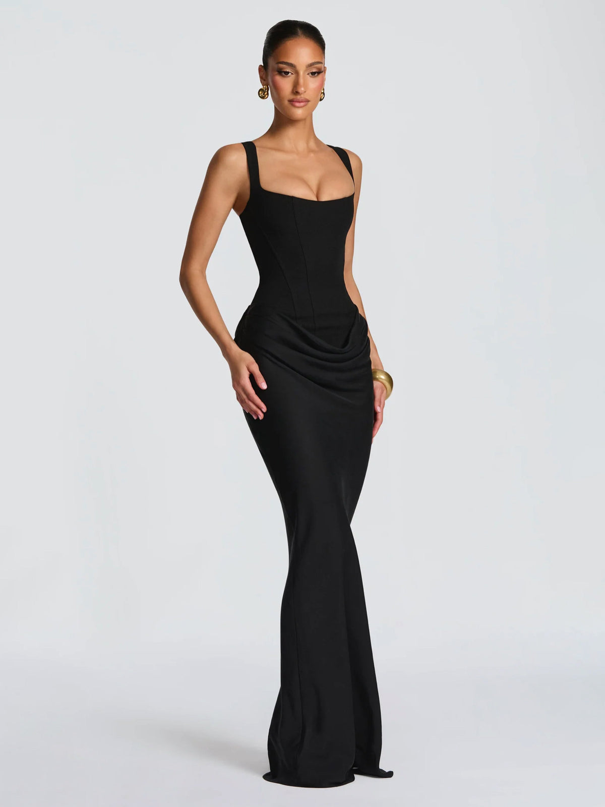 Structured Corset Bodice Lace-Up Back Draped Maxi Dress