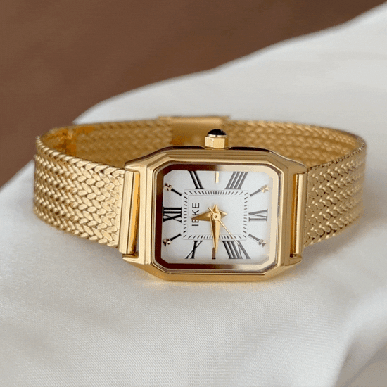This exquisite timepiece elegantly combines artistic heritage with retro charm, featuring a pristine white rectangular dial set in a gold-tone bezel. Its distinctive gold alloy bracelet showcases an intricate wheat-stalk pattern, evoking nostalgic elegance.