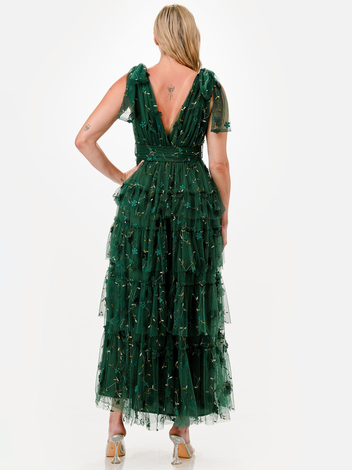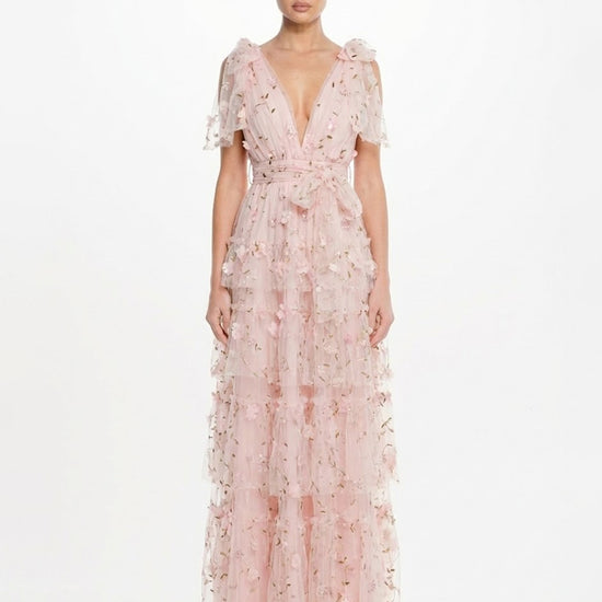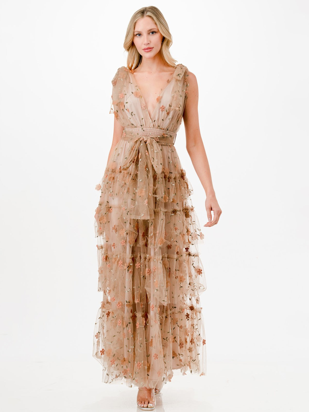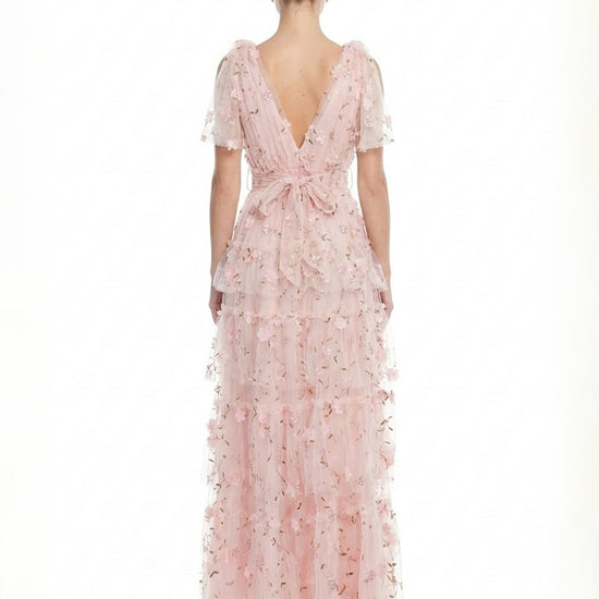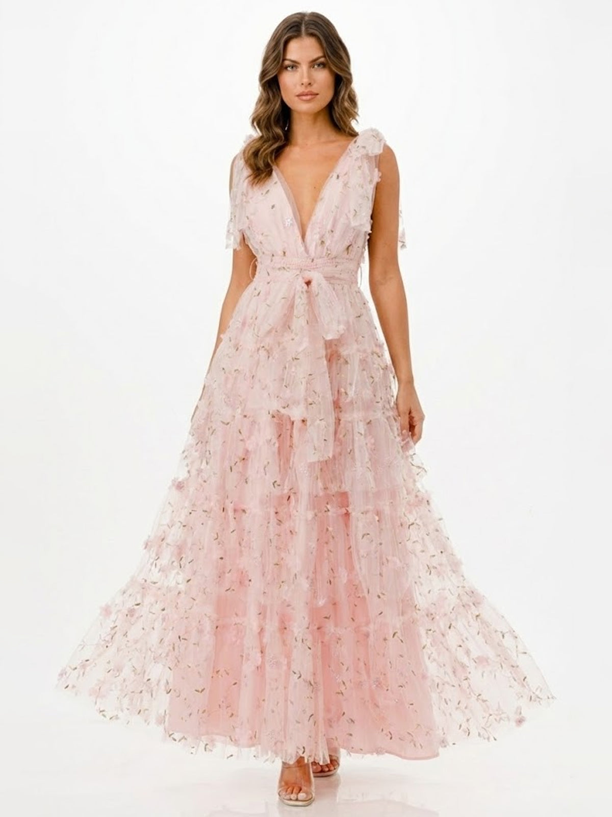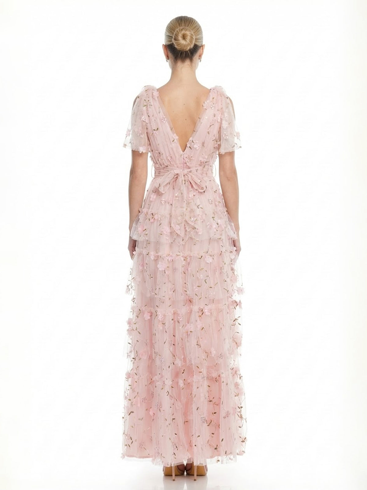 Step straight into a fairytale with this enchanting tulle gown. The dress is scattered with delicate 3D floral appliques that add incredible texture and whimsy to the soft, airy fabric. It features a plunging V-neckline framed by romantic flutter sleeves, while the matching V-back ensures you look stunning from every angle. With a self-tie sash to cinch the waist and a cascading tiered skirt that floats as you move, this is the ultimate choice for garden weddings, proms, or magical photoshoots.
