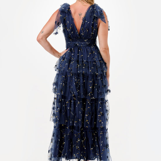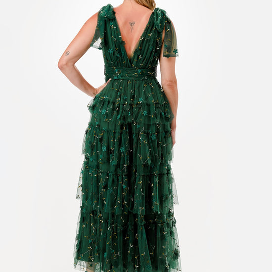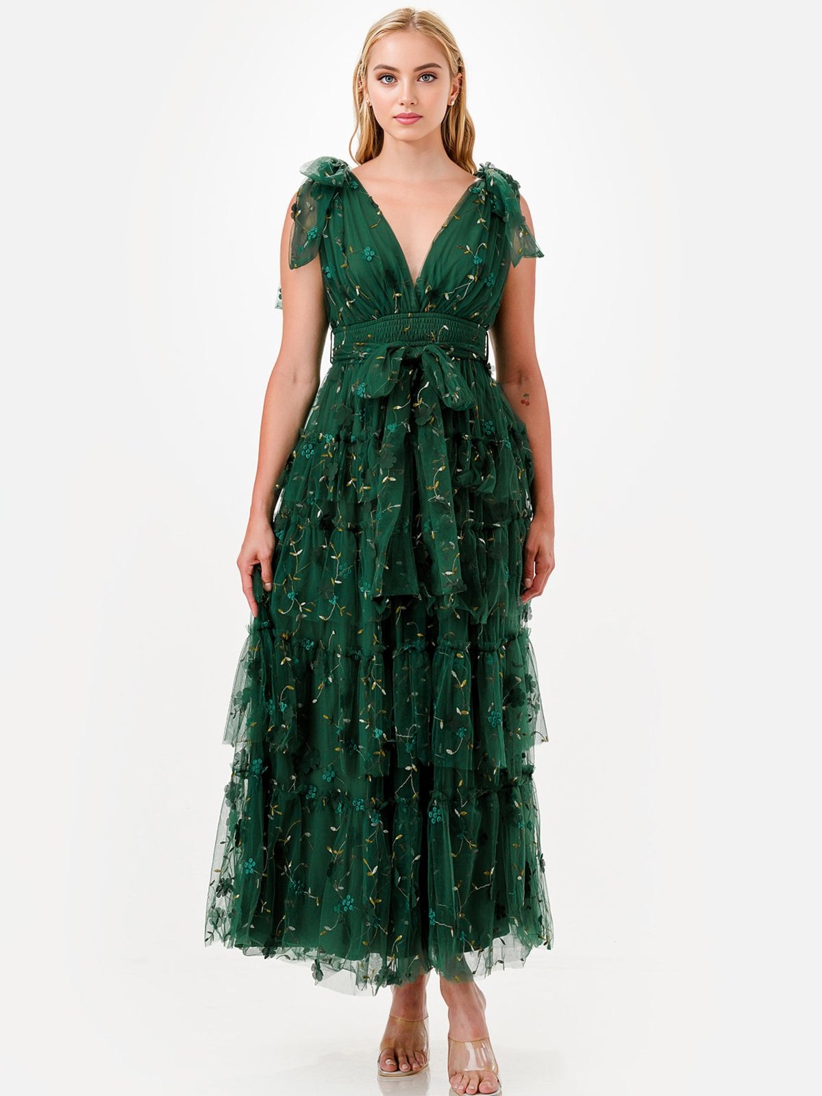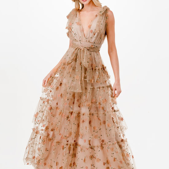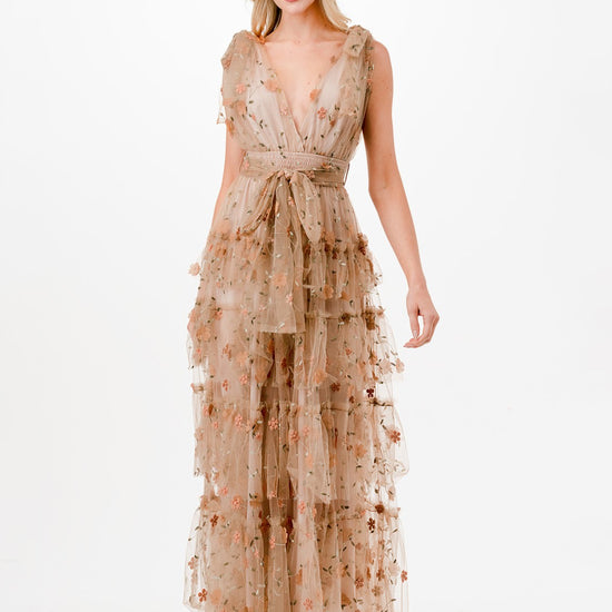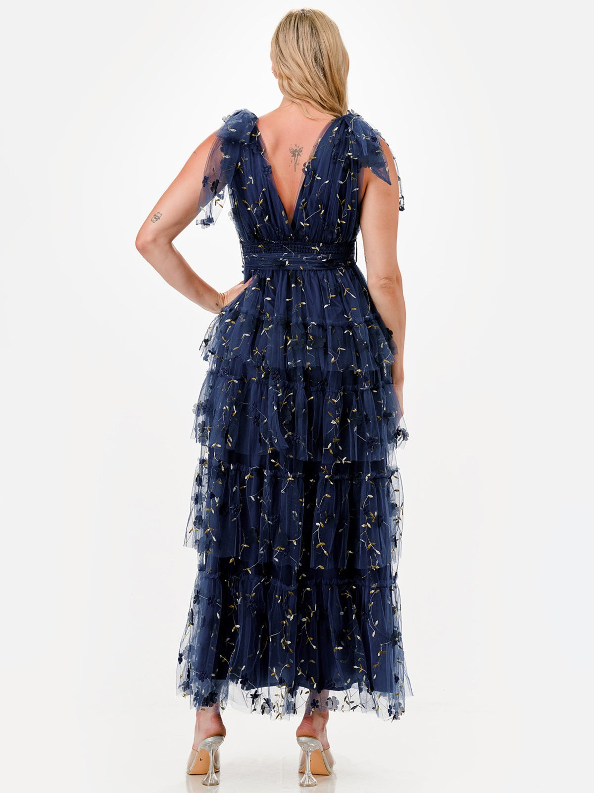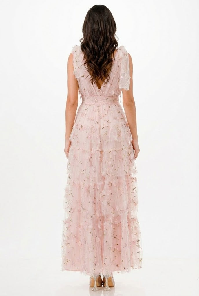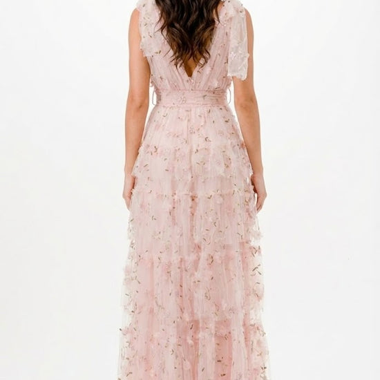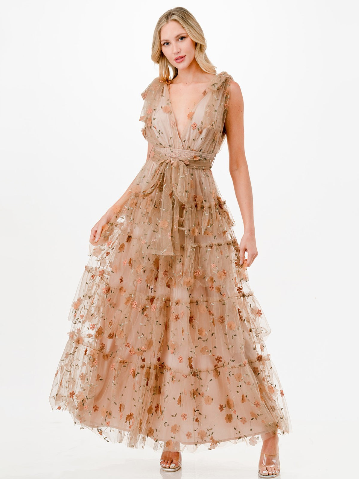 Step straight into a fairytale with this enchanting tulle gown. The dress is scattered with delicate 3D floral appliques that add incredible texture and whimsy to the soft, airy fabric. It features a plunging V-neckline framed by romantic flutter sleeves, while the matching V-back ensures you look stunning from every angle. With a self-tie sash to cinch the waist and a cascading tiered skirt that floats as you move, this is the ultimate choice for garden weddings, proms, or magical photoshoots.