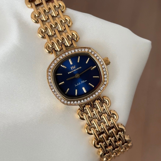 Experience refined modern luxury through this elegant blue oval dial watch. The captivating azure face features a delicate sunburst pattern, beautifully framed by a gold border sparkling with crystal details.