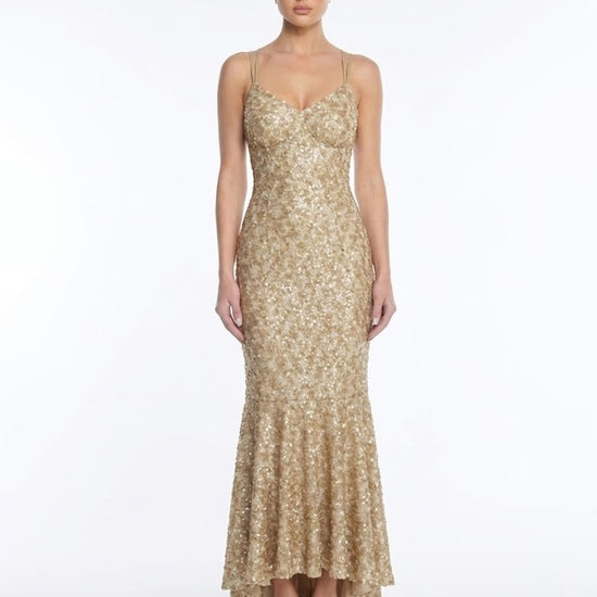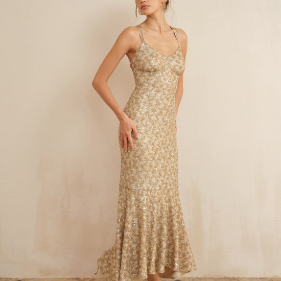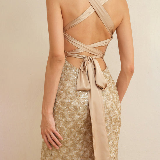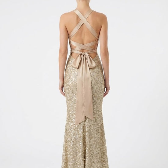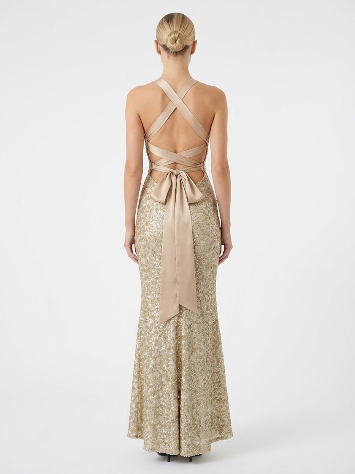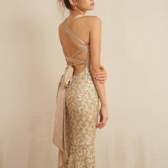 Shimmer from every angle in this light-catching masterpiece. The front features a flattering v-neckline and thin straps that lead to a breathtaking open back. Elegant criss-cross straps and a statement tie-back closure ensure a perfectly snatched fit. Finished with a graceful flared hem, this look creates a stunning trumpet silhouette for your next gala or celebration.