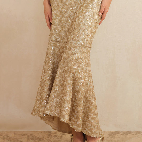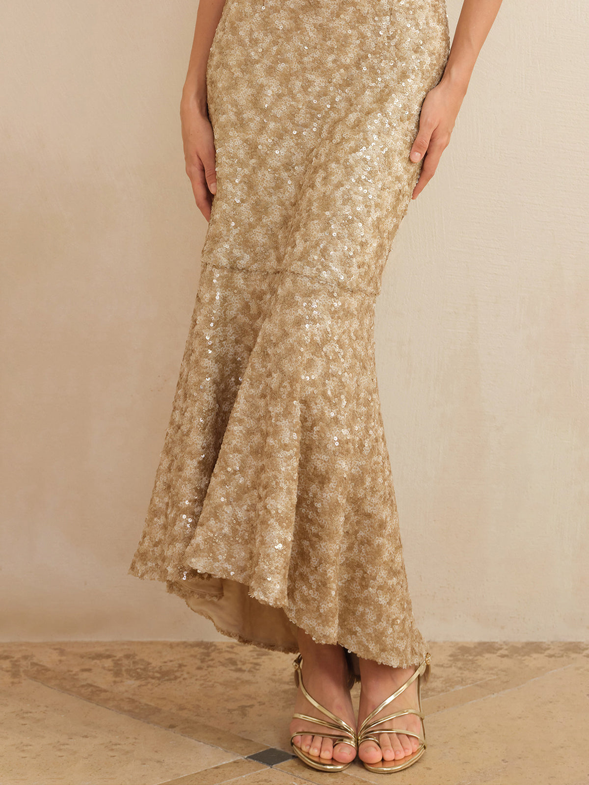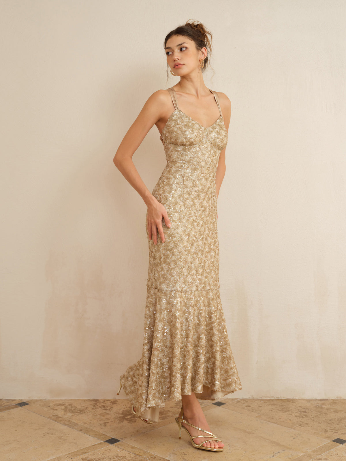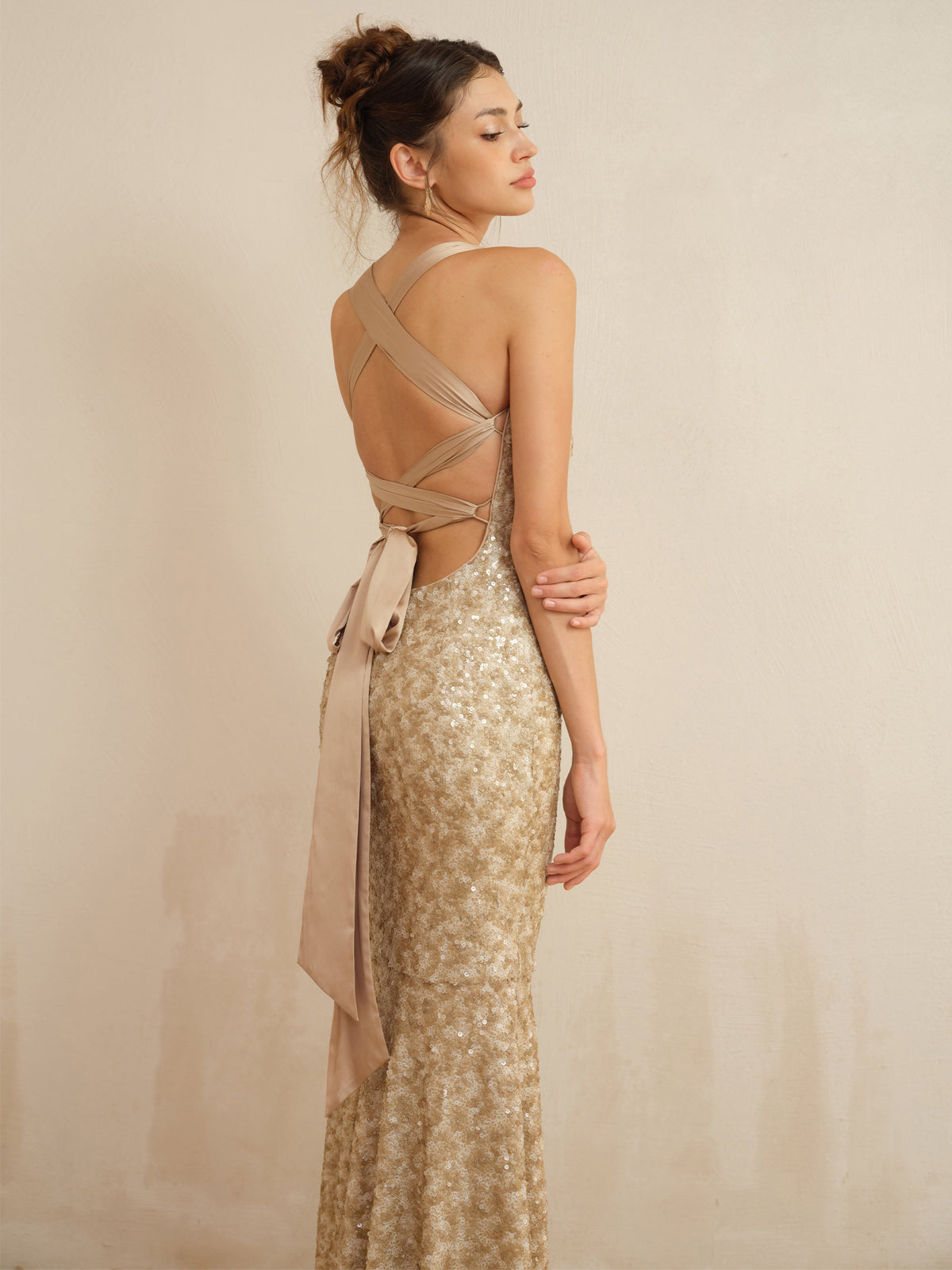 All-over Sequin Cross-Back Silhouette | V-Neck Tie-Back Trumpet