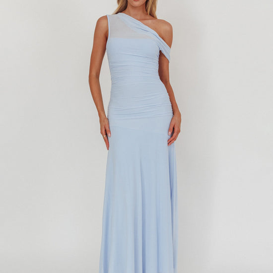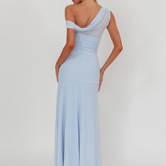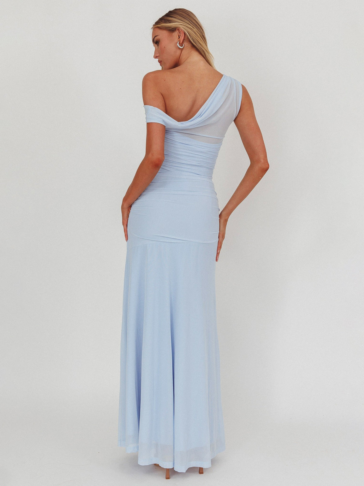 Bring the fairytale to life in this dreamy evening gown. The design features a stunning asymmetric neckline with a sheer mesh illusion panel that creates a soft, floating effect across the shoulder. Crafted from fine mesh with all-over ruching, it hugs your figure gently while offering a comfortable stretch. The back continues the sheer detailing for a look that’s elegant from every angle. Perfect for bridesmaids, galas, or any moment you want to feel unforgettable.