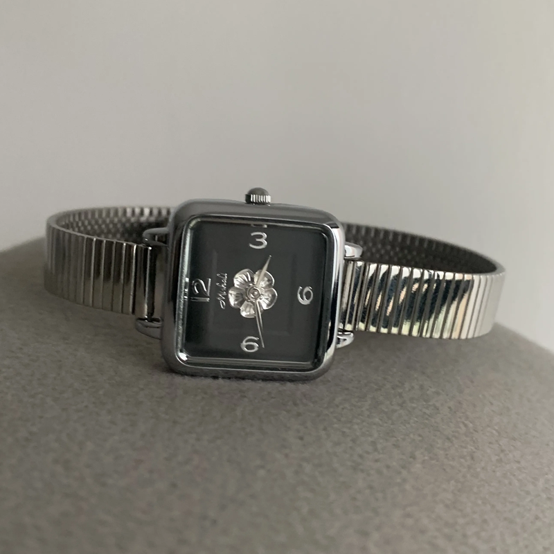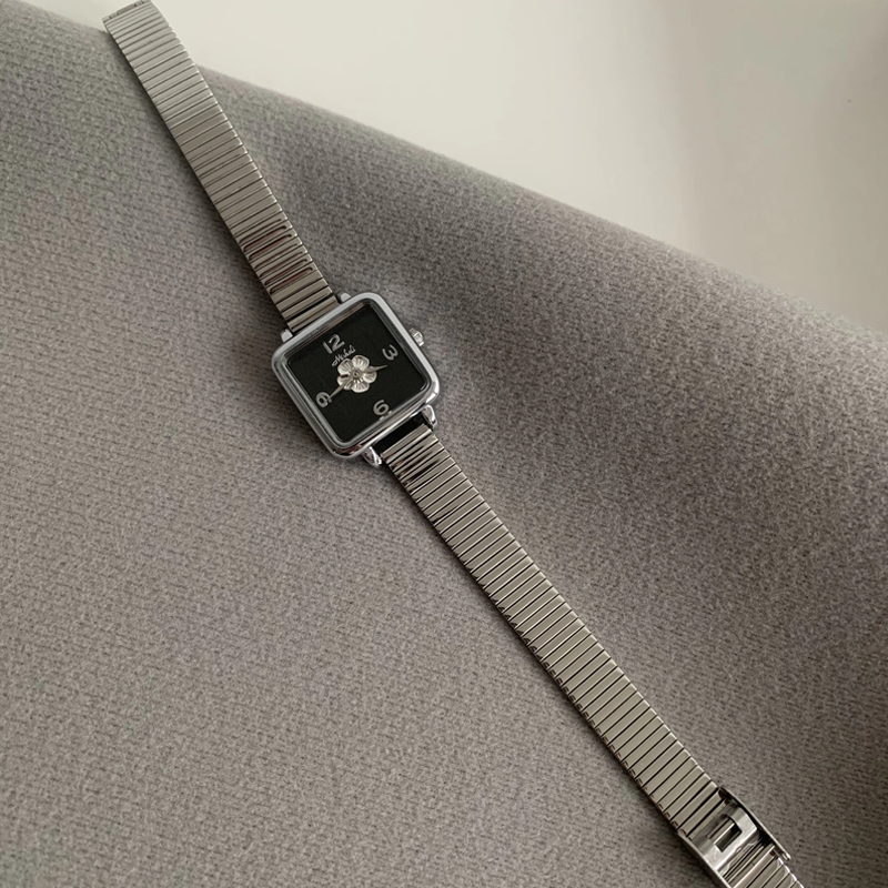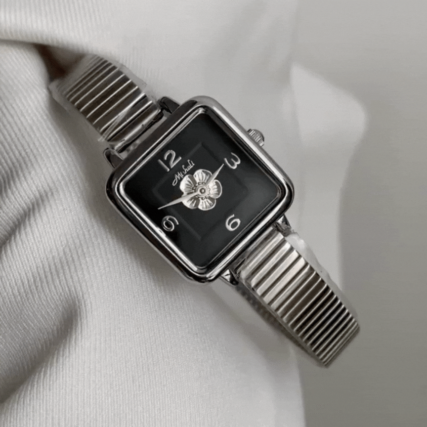 Este refinado reloj de cuarzo luce un brazalete plateado con una llamativa esfera cuadrada negra. Adornado con un delicado diseño de camelia, irradia una elegancia atemporal y moderna a la vez. El equilibrio perfecto entre sofisticación y estilo, ideal tanto para el día a día como para ocasiones especiales.