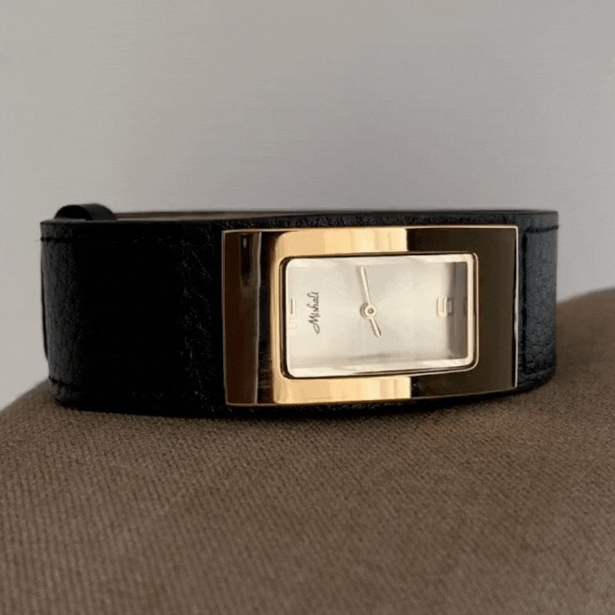 Chic women’s quartz watch with a wide black leather strap, gold rectangular case, and black dial, showcasing bold vintage-inspired elegance.