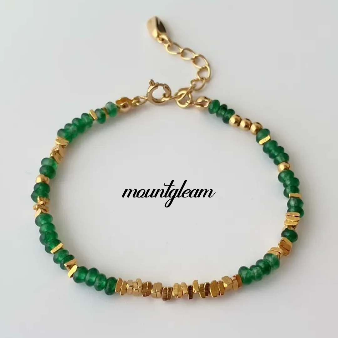 Delicada pero impactante, esta pulsera minimalista presenta cristales verdes irregulares engastados en una refinada cadena dorada. Cada piedra aporta un toque orgánico y único, creando el equilibrio perfecto entre belleza natural y elegancia moderna. Ideal para combinar con otras piezas o para lucir sola.