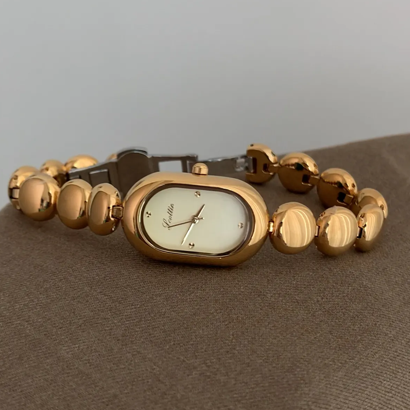 Pulsera con cuentas de oro: Reloj de cuarzo para mujeres de oro y dial ovalado