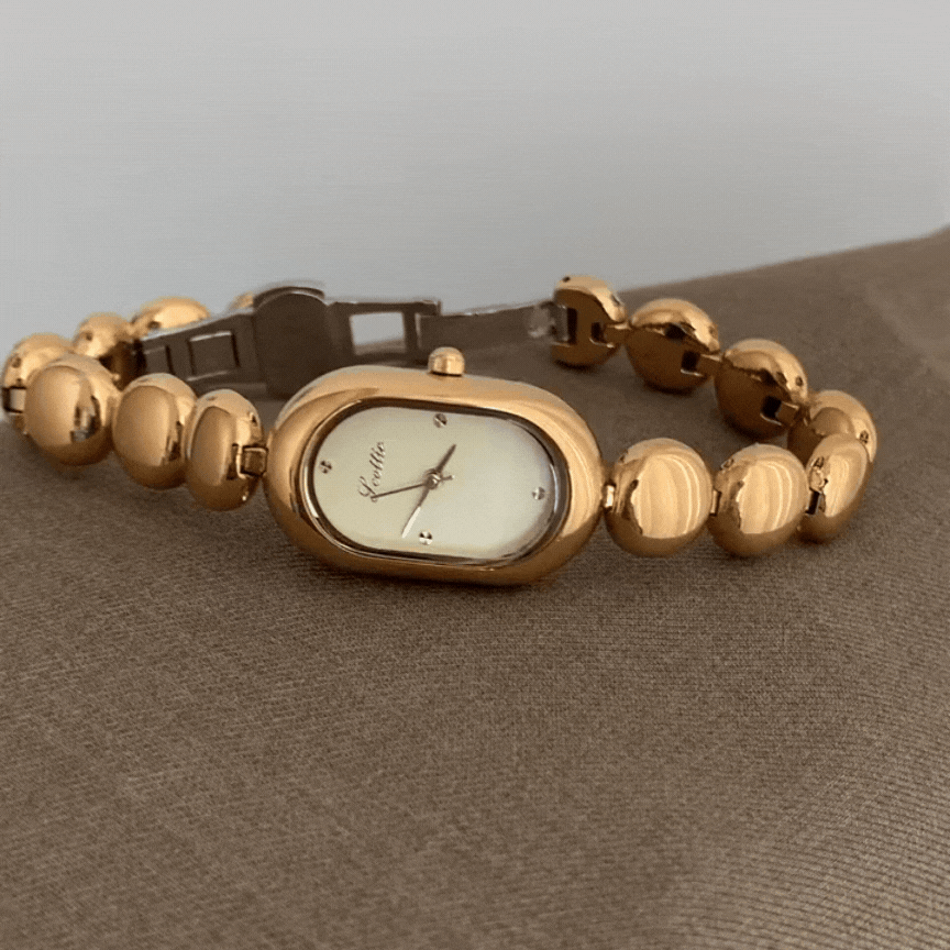 Con un brazalete de cuentas doradas y una elegante esfera ovalada blanca, este reloj irradia una sofisticación atemporal. La caja dorada le aporta un toque de lujo, convirtiéndolo en un accesorio refinado para cualquier ocasión.