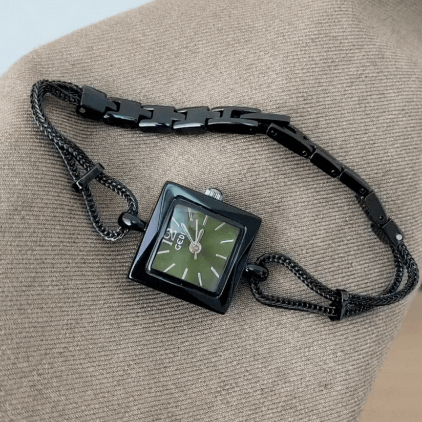 Este distintivo reloj de cuarzo para mujer luce una elegante pulsera de cadena negra con una esfera cuadrada verde que le da una estética moderna y audaz. Su diseño único combina elegancia con un toque vintage, convirtiéndolo en un accesorio destacado para cualquier ocasión. Perfecto para quienes aprecian un estilo refinado pero original.
