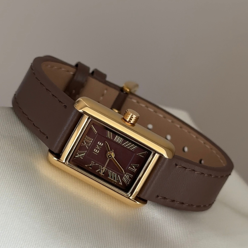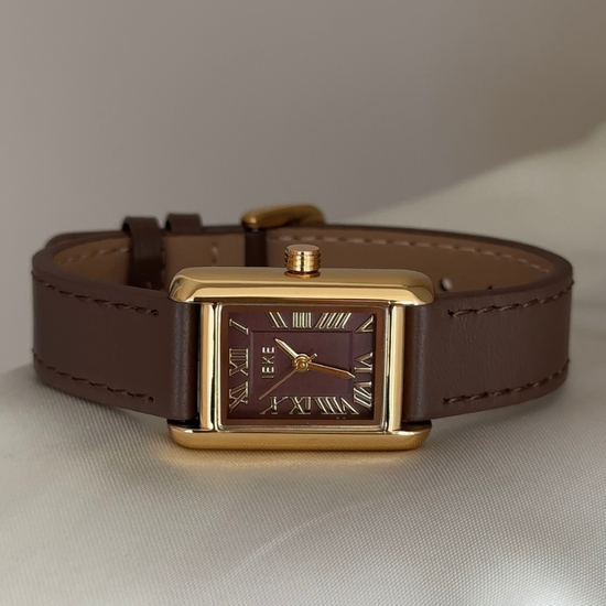 This elegant watch captures vintage charm with its rich brown square dial framed by a polished gold bezel, evoking classic sophistication. The brown leather strap complements the dial while ensuring comfort and durability.
