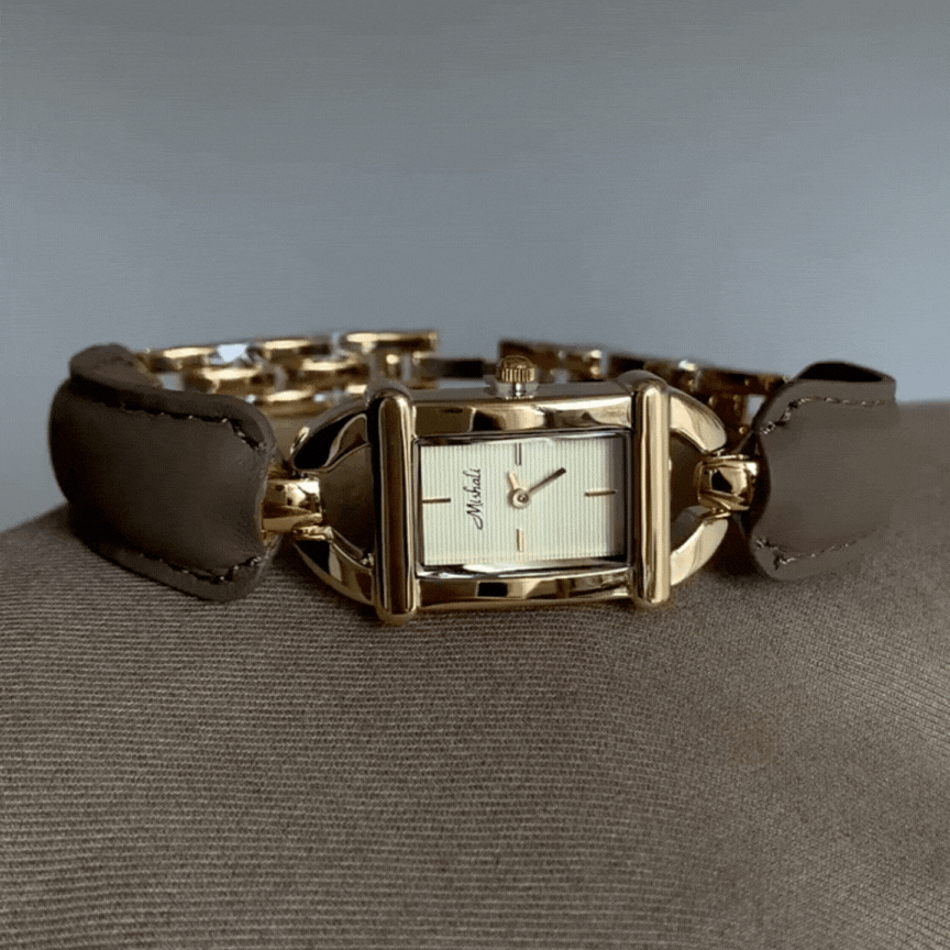 Este reloj de cuarzo de inspiración vintage cuenta con una mini esfera rectangular dorada emparejado con un Correa envolvente de piel suave de color gris elefante. Con su Tonos sobrios y silueta clásicaEs una pieza sutil pero elegante que añade un encanto atemporal a cualquier look.