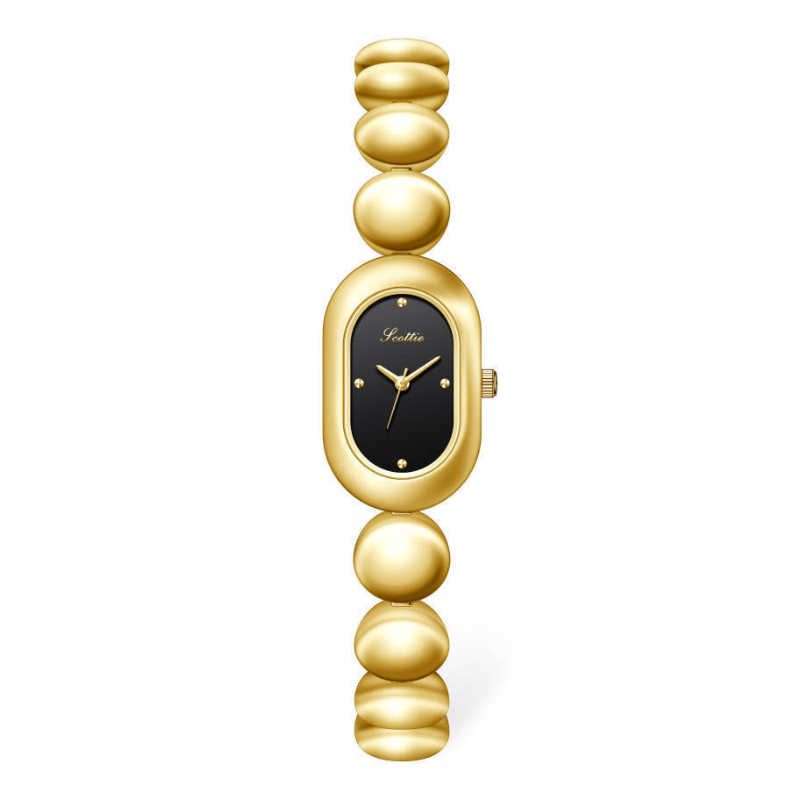 Este refinado reloj de cuarzo en tono dorado cuenta con una elegante esfera negra ovalada y un distintivo pulsera de acero inoxidable con cuentas, combinando elegancia con encanto moderno. Con movimiento de cuarzo preciso y un diseño sofisticado, es el accesorio perfecto para un estilo sin esfuerzo, ya sea en el trabajo o en ocasiones especiales.
