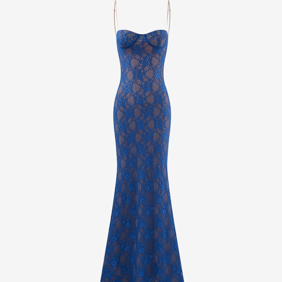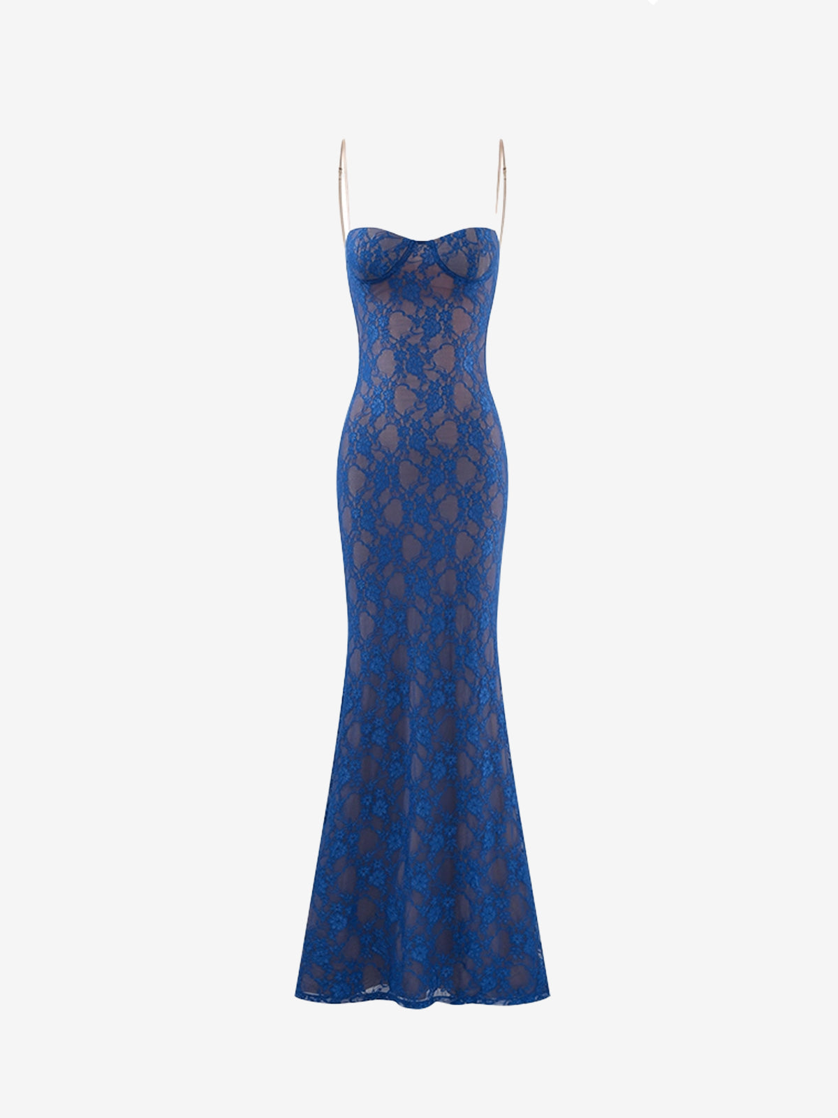 Captivate the room in this Electric Sapphire Lace Mermaid Gown, designed for unforgettable evenings and luxe tropical getaways. Crafted from intricate floral lace over a nude lining, this dress creates a sophisticated illusion effect that highlights the vibrant blue hue. The figure-hugging silhouette sculpts your curves before flaring into a graceful fishtail hem, while the delicate spaghetti straps and daring open-back design add a touch of sensual elegance. Whether for a birthday celebration or a sunset dinner, this gown offers a stunning, photo-ready look.